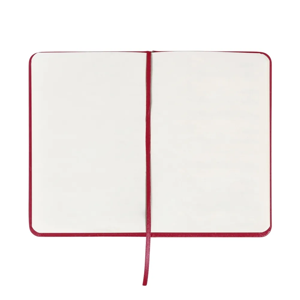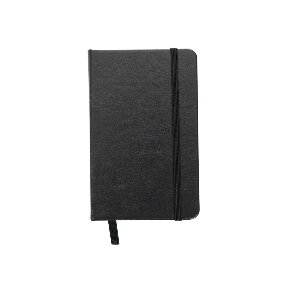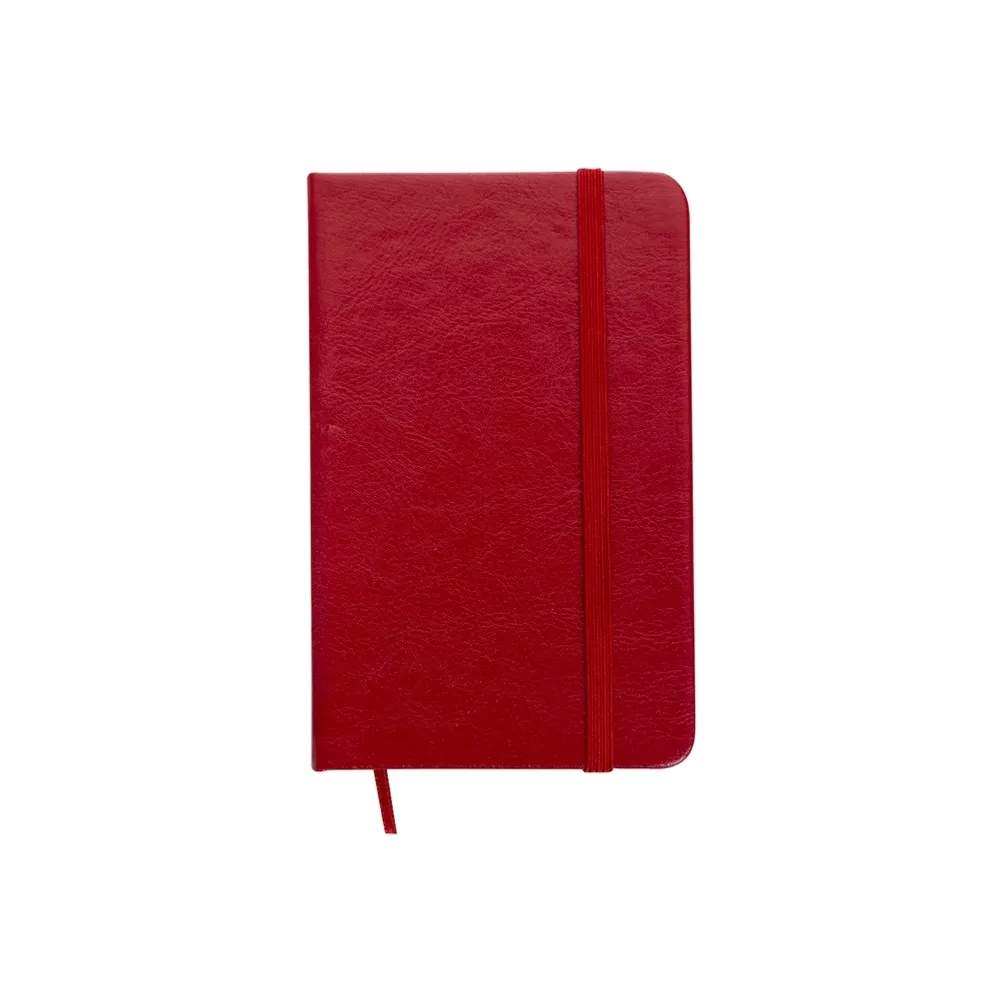 Caderneta de couro sintético com elástico para lacre e marcador de página em cetim, contém 80 folhas sem pauta.