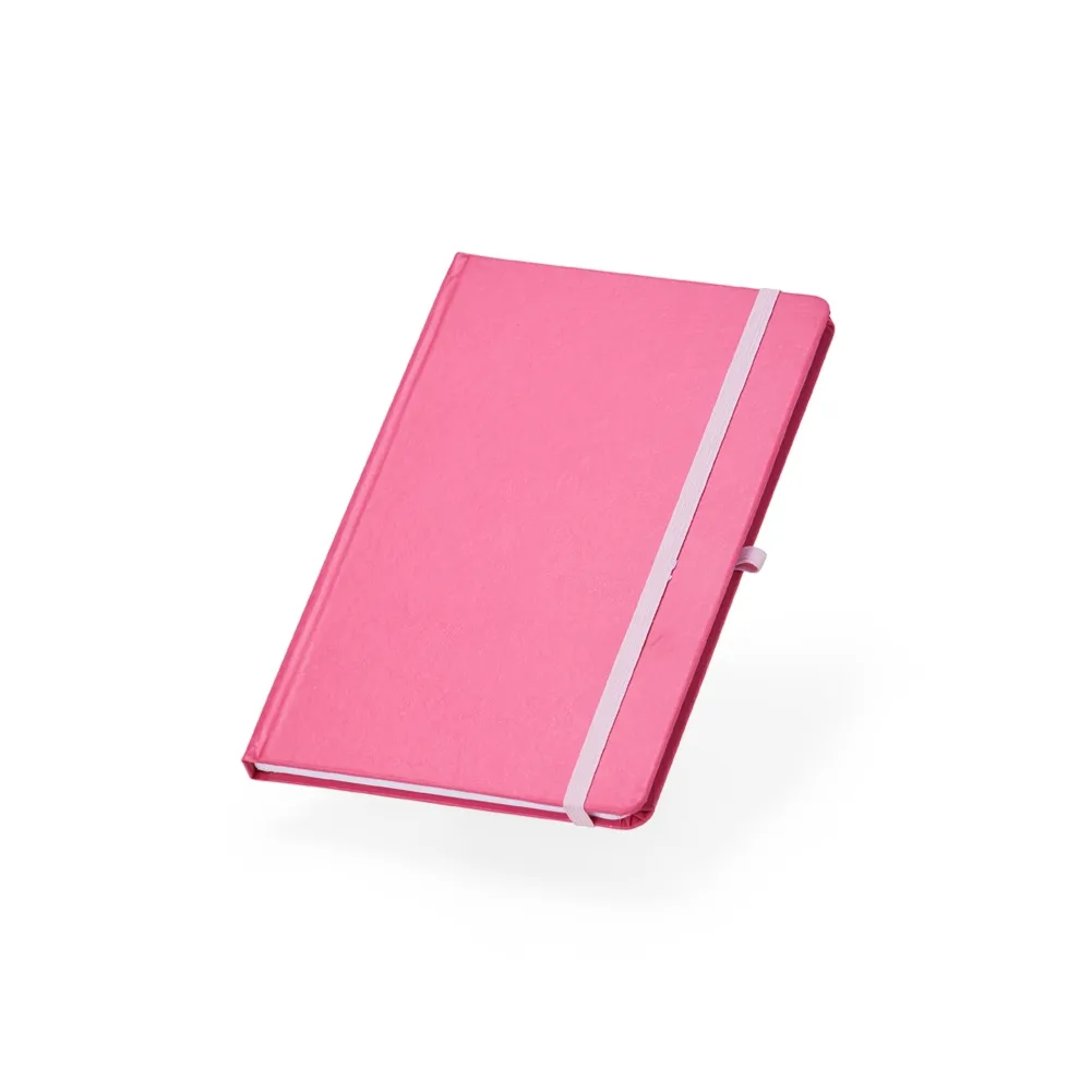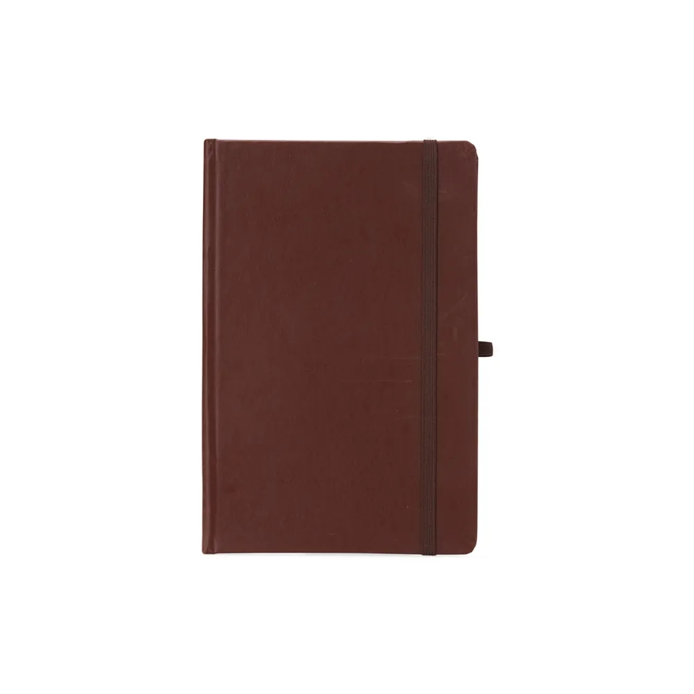 Caderneta de couro sintético com suporte para caneta, elástico para lacre e marcador de página em cetim, contém aproximadamente 80 folhas com pauta na cor branca.