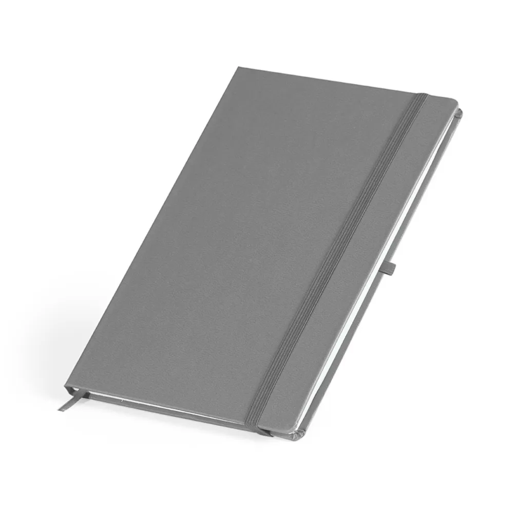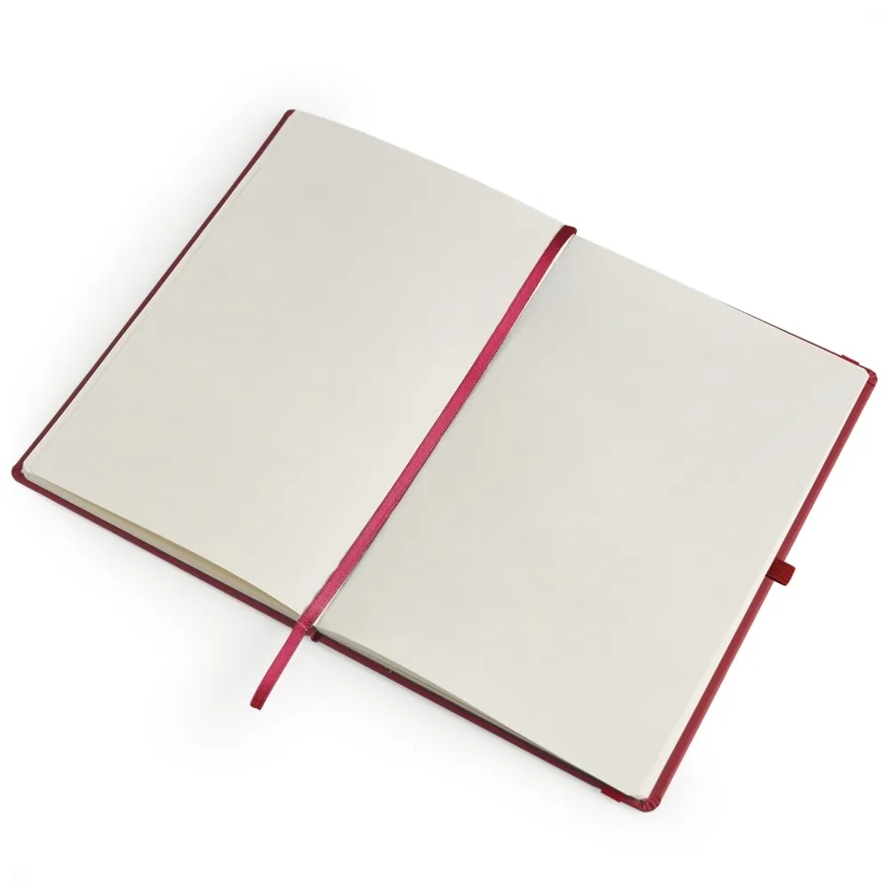 Caderneta em couro sintético com marcador de página em cetim e fita elástica para fechar. Contém aproximadamente 80 folhas sem pauta.