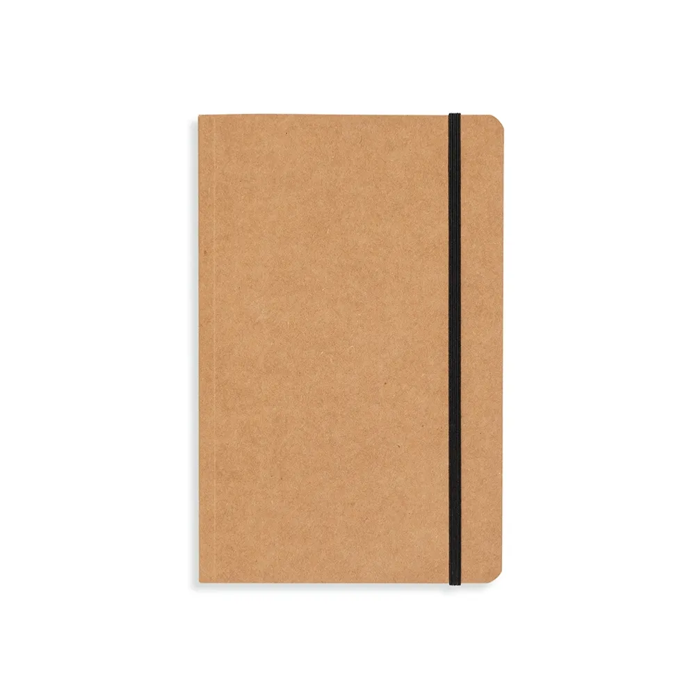 Caderneta em material kraft, frente e verso liso com fita elástica para fechar. Contém aproximadamente 80 folhas amareladas sem pauta.