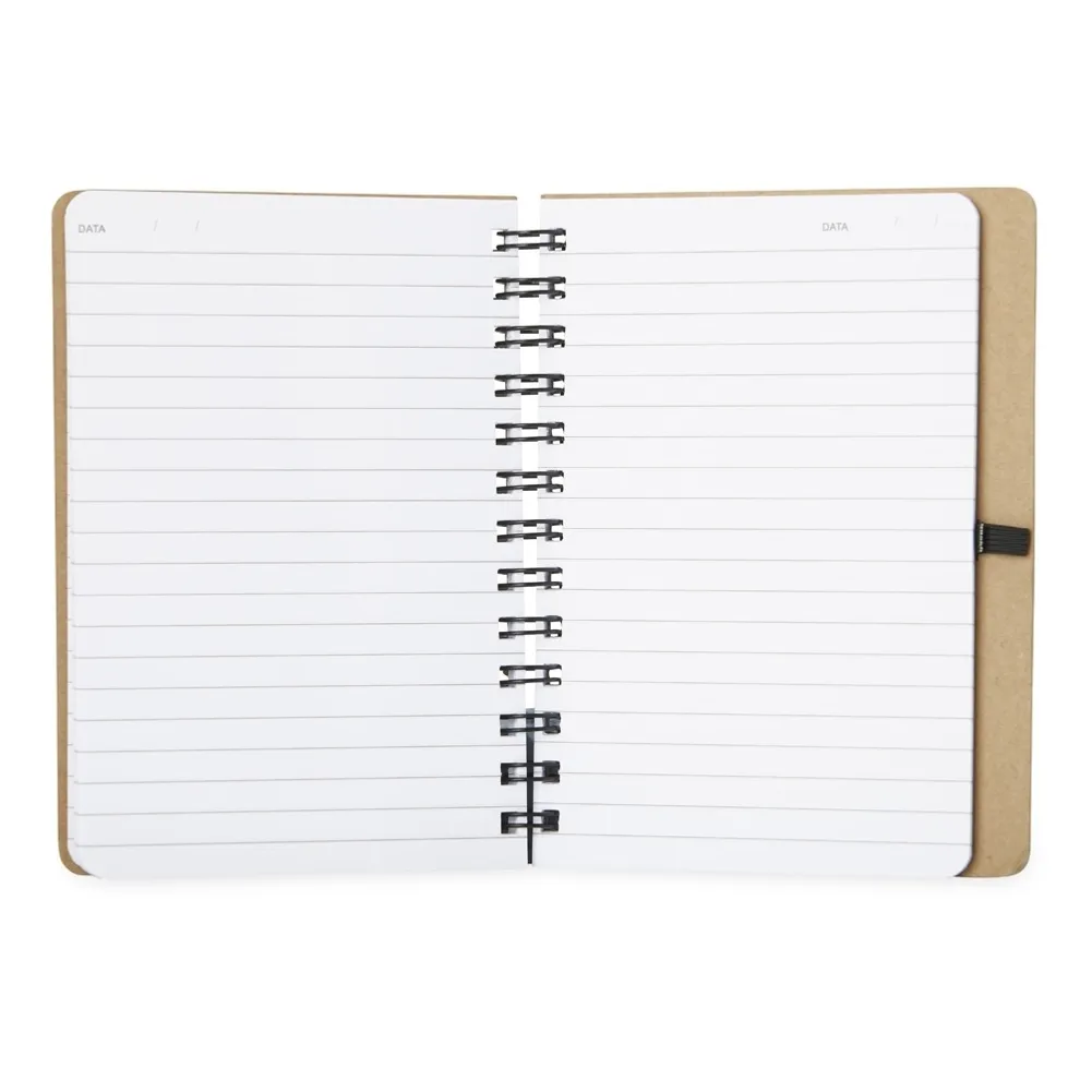 Caderneta capa dura em kraft com wire-o e porta caneta. Contém aproximadamente 100 páginas pautadas na cor branca.