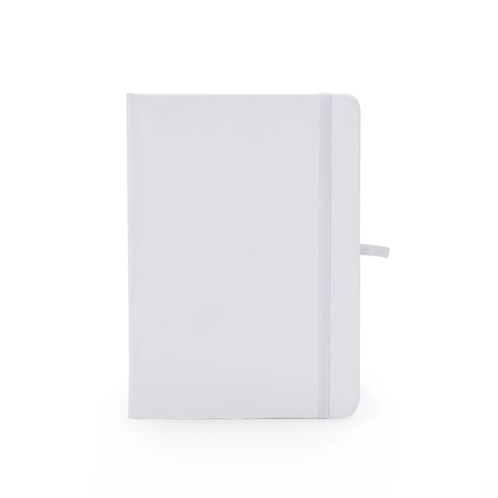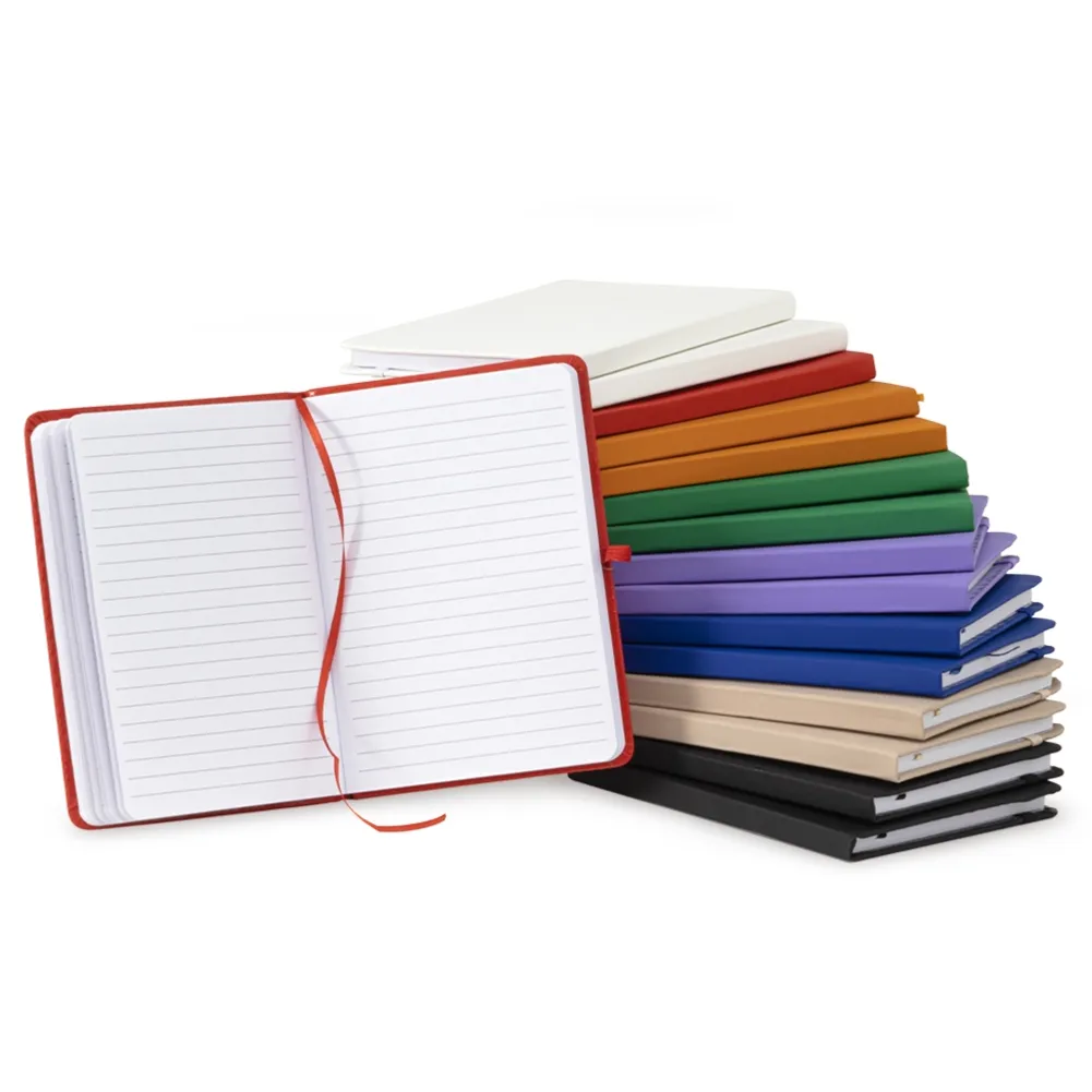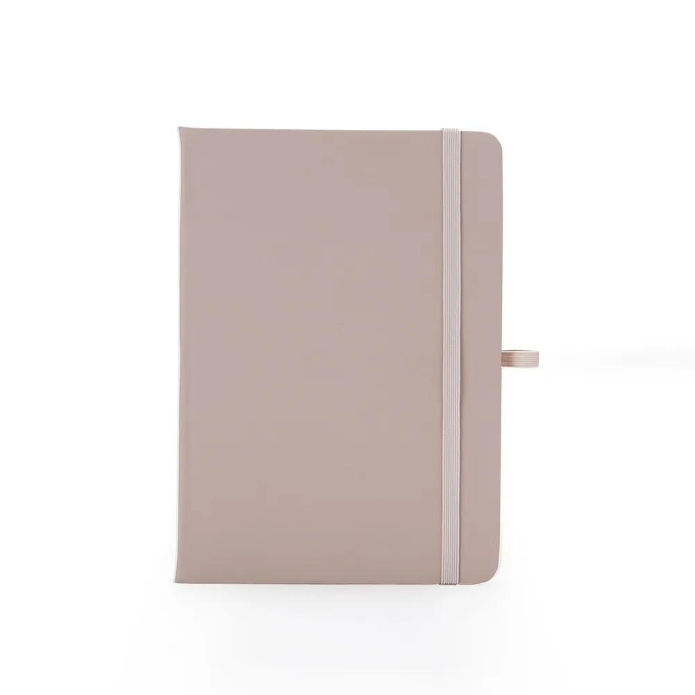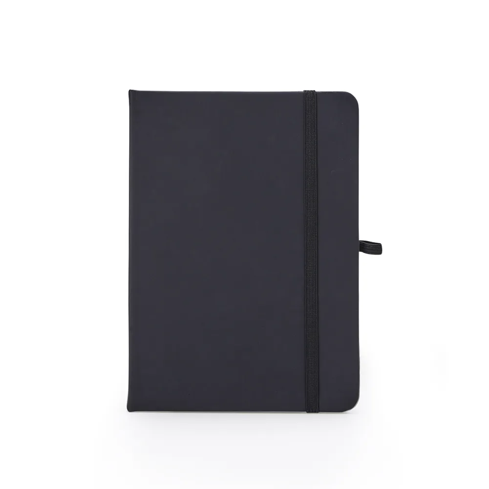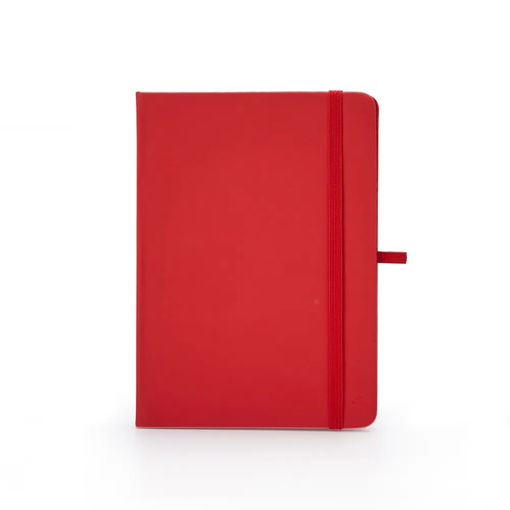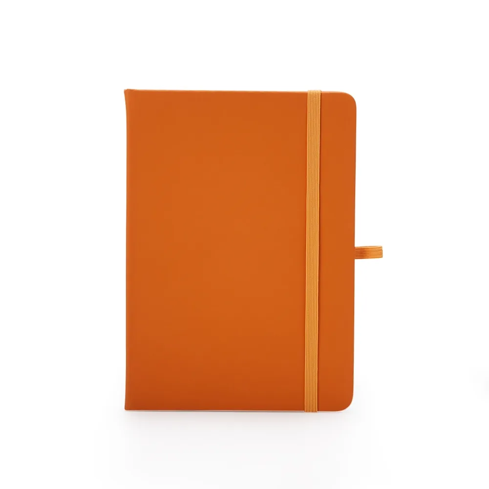 Caderneta emborrachada com suporte para caneta, elástico para lacre e marcador de página em cetim, contém aproximadamente 80 folhas com pauta na cor branca.
