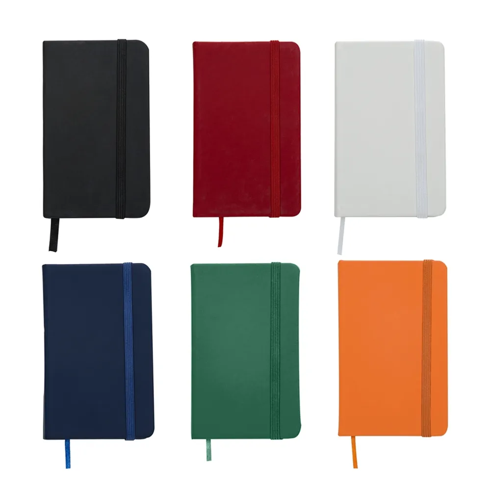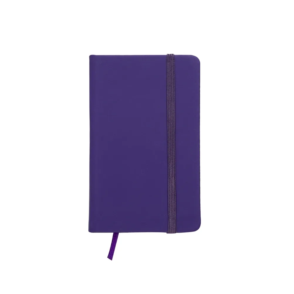 Caderneta emborrachada com elástico para lacre e marcador de página em cetim, contém aproximadamente 84 folhas com pauta na cor marfim.