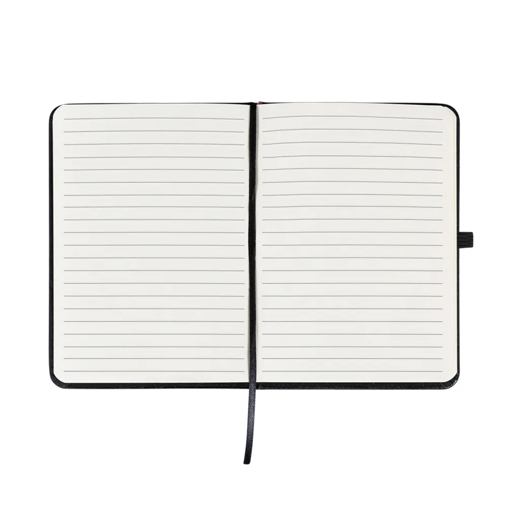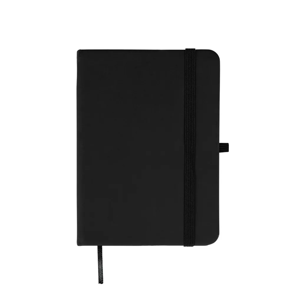Caderneta emborrachada com elástico para lacre, marcador de página em cetim e porta caneta, contém aproximadamente 84 folhas marfim com pauta.