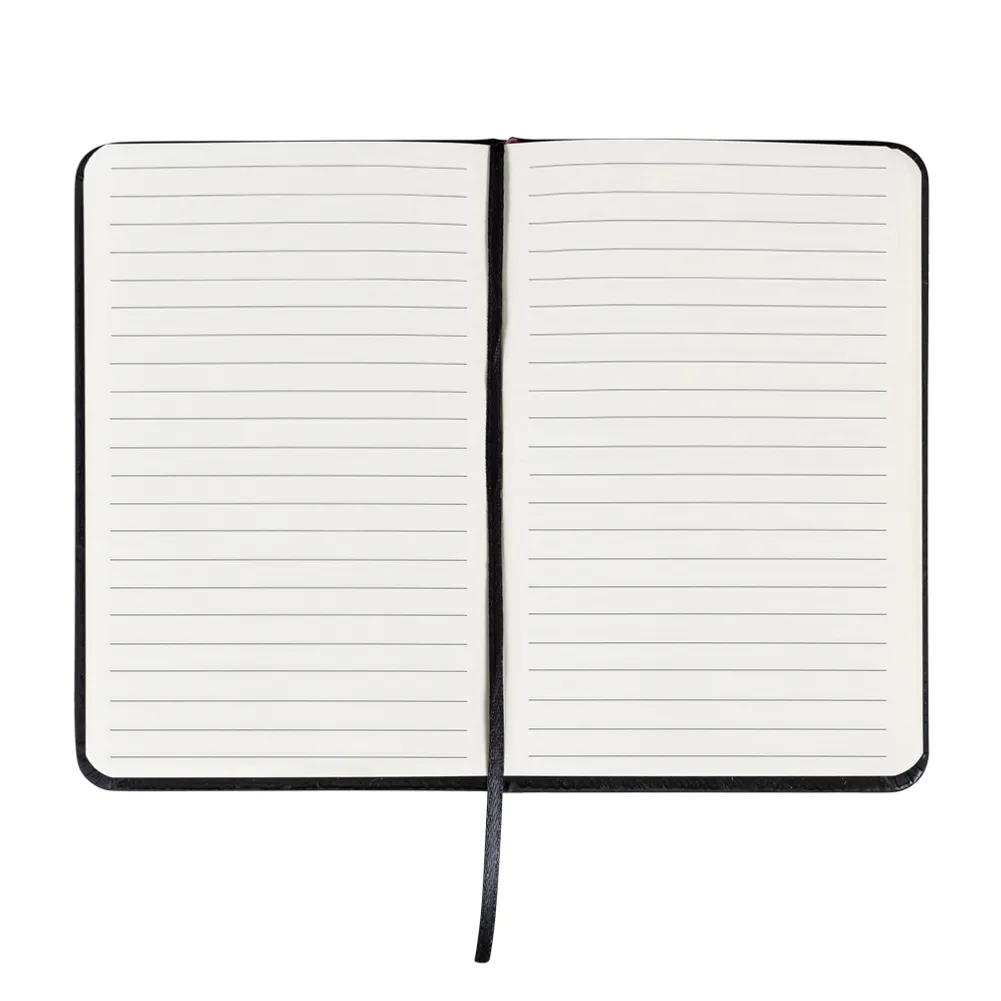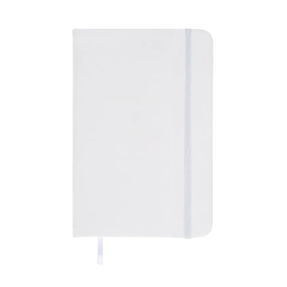 Caderneta emborrachada com elástico para lacre e marcador de página em cetim, contém aproximadamente 76 folhas com pauta na cor marfim.