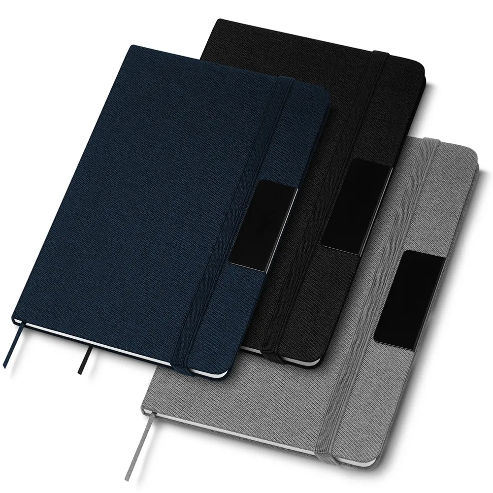 Caderneta com capa dura em RPET (PET Reciclado) e inox, com porta caneta e marca página em cetim. Contém aproximadamente 80 folhas com pauta.