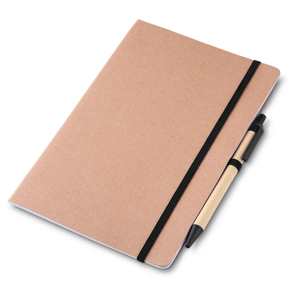 Kit escritório, contendo: 1 Caderno de anotações 21,5x14cm, capa em papel kraft com elástico, suporte para caneta e miolo com 30 folhas. 1 Caneta corpo em papel reciclado com detalhe em plástico. 30 folhas Dimensão do Produto: 21,5x14,5x0,4cm Peso do Produto: 0,080kg Quant. por Caixa: 120 pçs Embalagem: Saco Plástico Dimensão da Caixa: 30x26x24cm Peso da Caixa: 11kg
