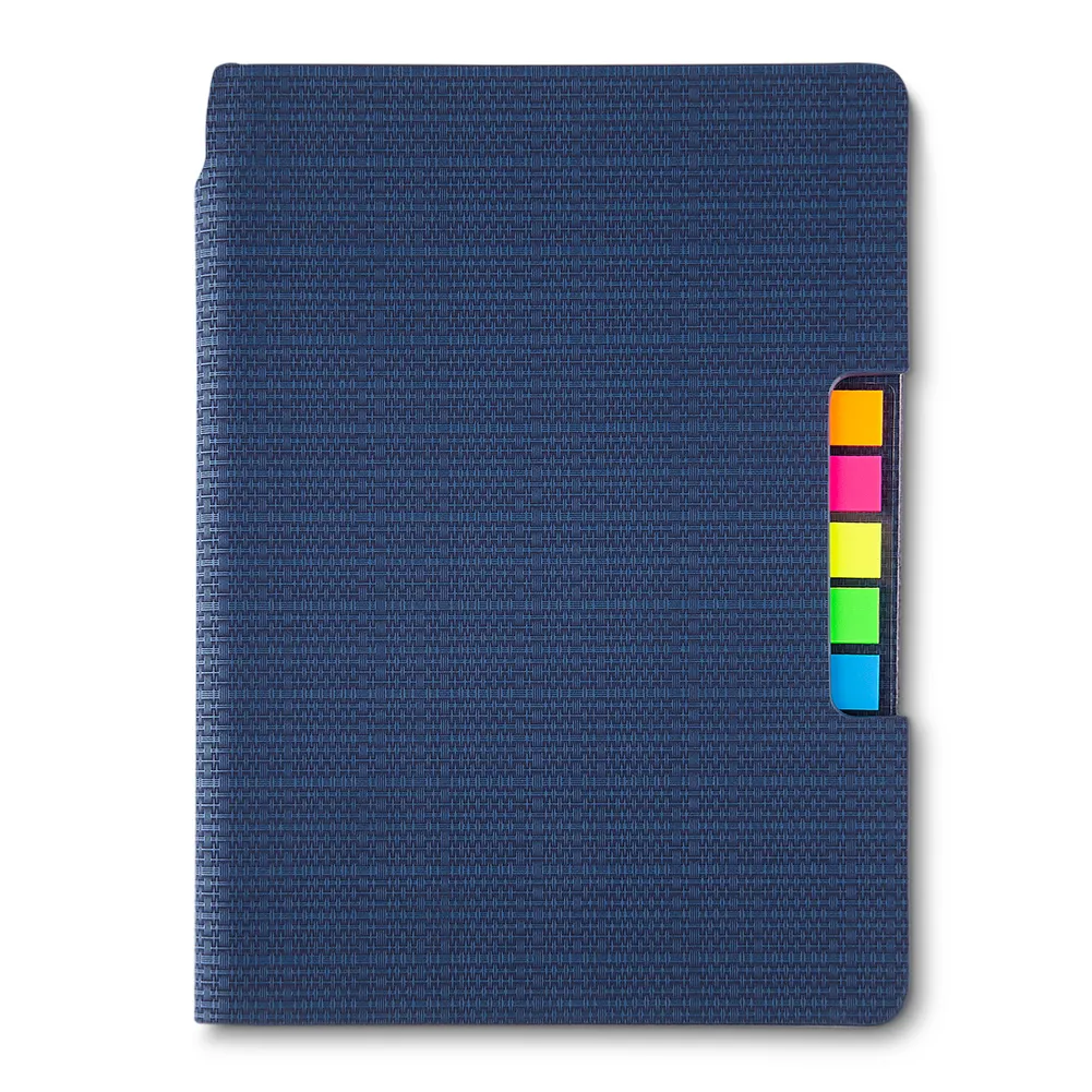 Caderno de anotações, com sticky notes, capa em material Sintético, miolo 80 folhas pautadas na cor bege. Dimensão Produto: 21x15x1,5cm Peso do Produto: 0,270kg Quant. por Caixa: 50pçs Quant. por Caixinha: 25pcs Embalagem: Saco Plástico Dimensão da caixa: 46x34,5x22cm Peso da caixa: 14,50kg