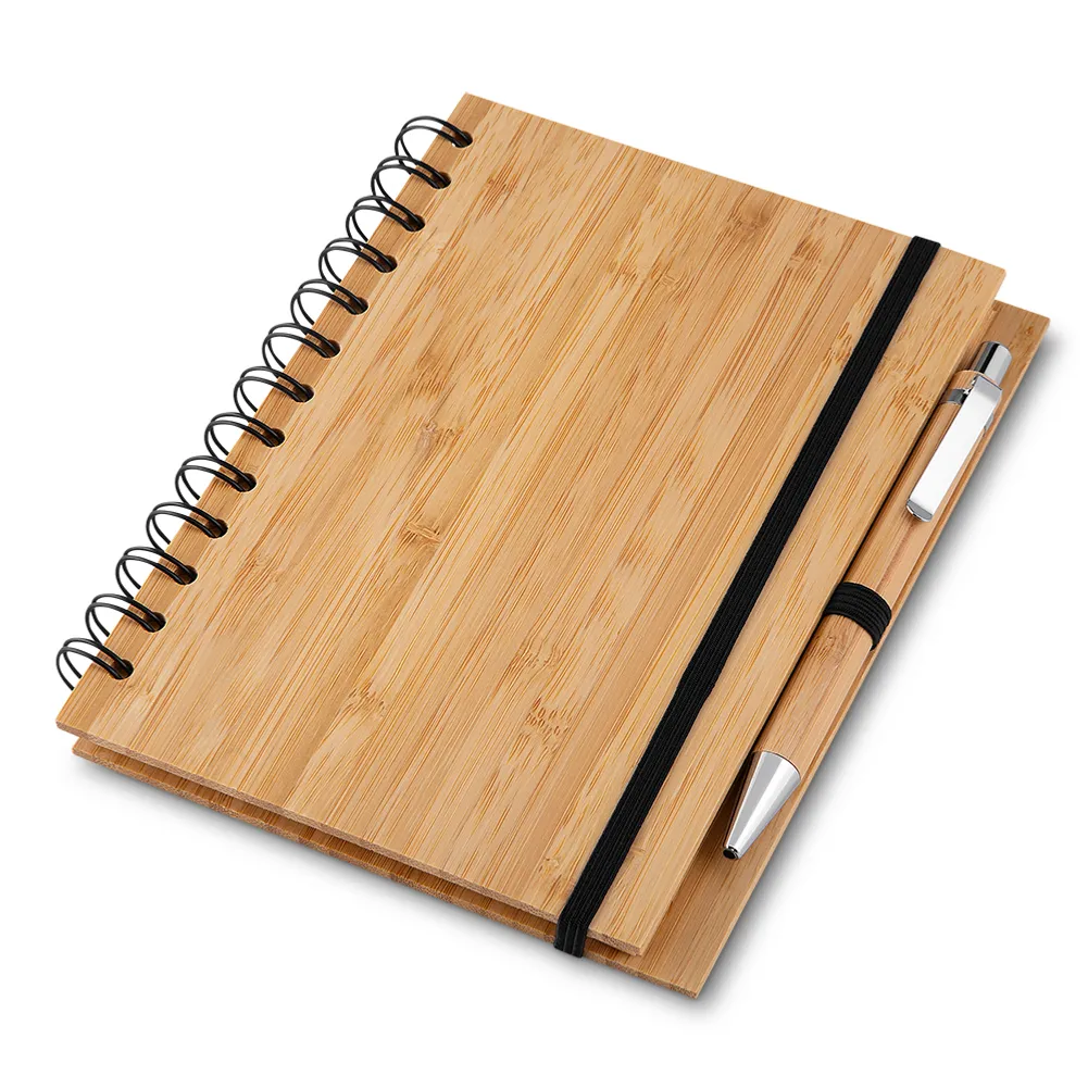 Kit escritório, contendo: 1 Caderno de anotações 18x13,5cm capa de bambu, com elástico, suporte para canetas e miolo com 70 folhas pautadas na cor bege; 1 Caneta de bambu com partes em metal. 70 folhas, 70g gramatura Dimensão do produto: 18x13,5x1,9cm Peso do Produto: 0,180kg Quant. por Caixa: 25pçs Embalagem: Saco Plástico Dimensão da caixa:39x32x24,5cm Peso da caixa: 10kg