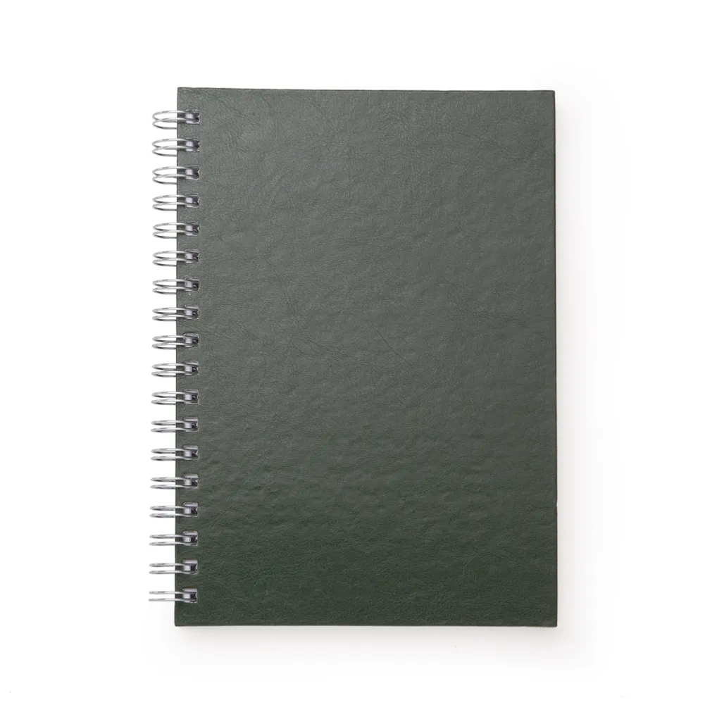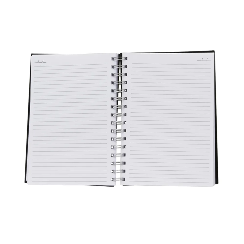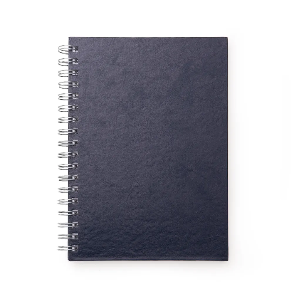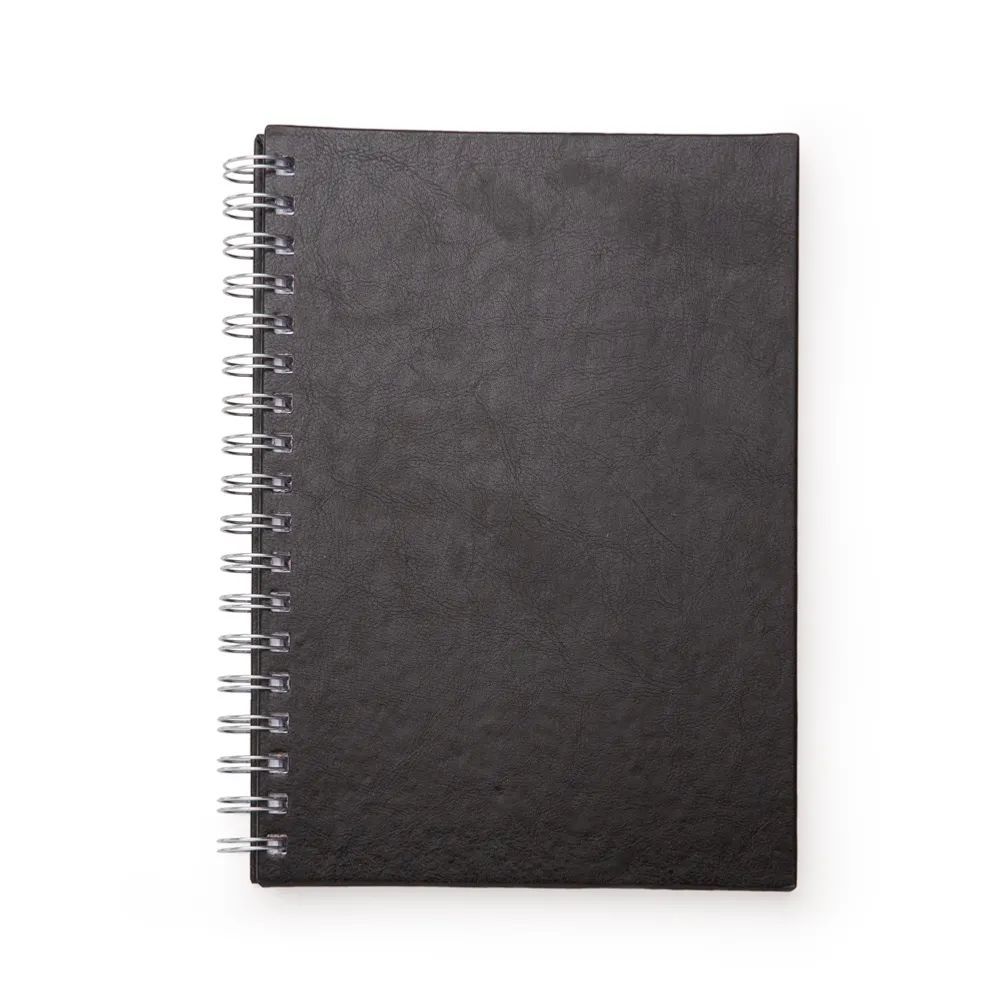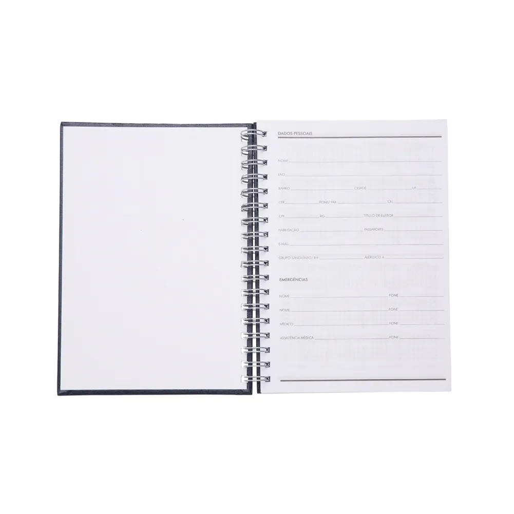 Caderno com capa de couro sintético texturizado e espiral prata metálico. Possui aproximadamente 100 folhas brancas pautadas e páginas para: dados pessoais, calendário de 2022 à 2025 e planejamento.
