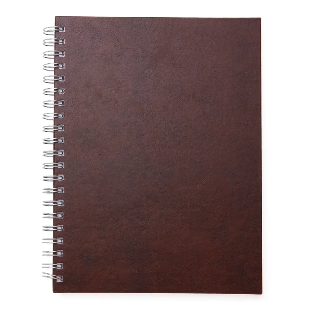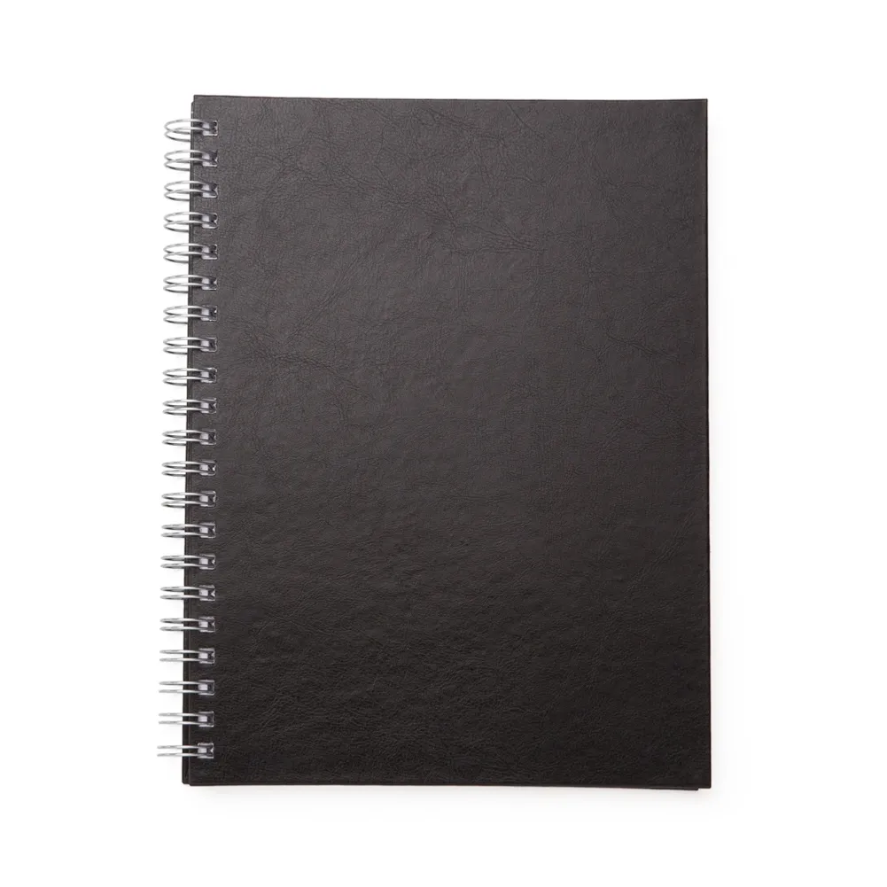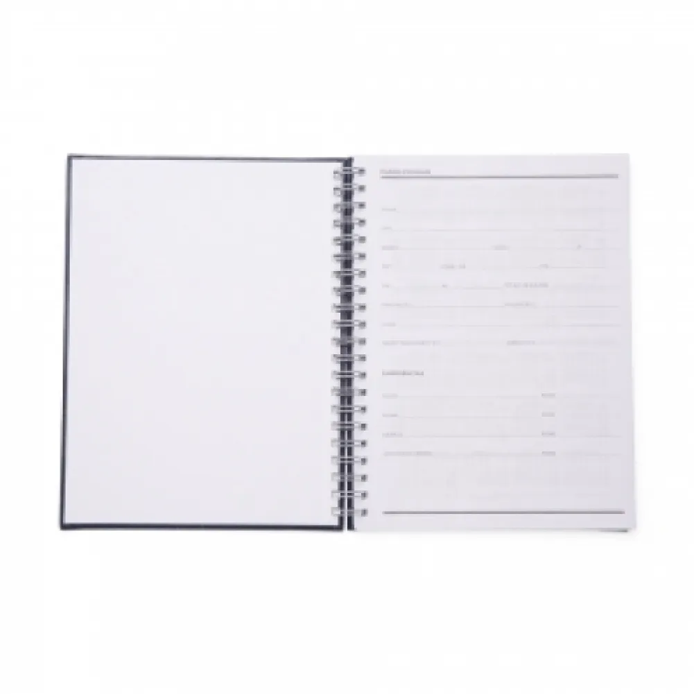 Caderno com capa de couro sintético texturizado e espiral prata metálico. Possui aproximadamente 100 folhas brancas pautadas e páginas para: dados pessoais, calendário de 2020 à 2023 e planejamento.
