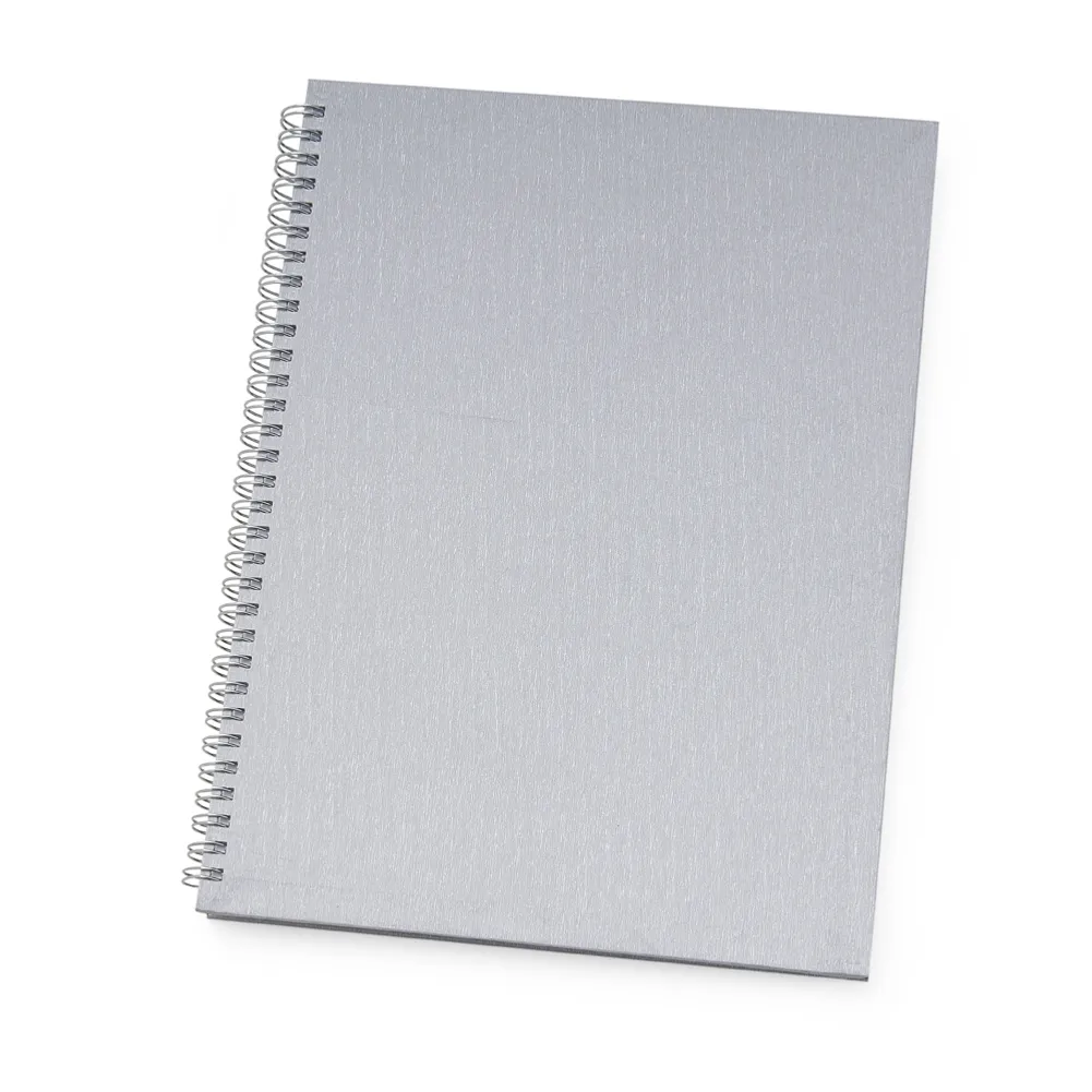 Caderno grande com pintura metalizada e wire-o prata. Miolo permanente e folhas para preenchimento de dados pessoais, comerciais e contatos. OBS.: PEDIDOS APENAS MÚLTIPLOS DE 10 PEÇAS!