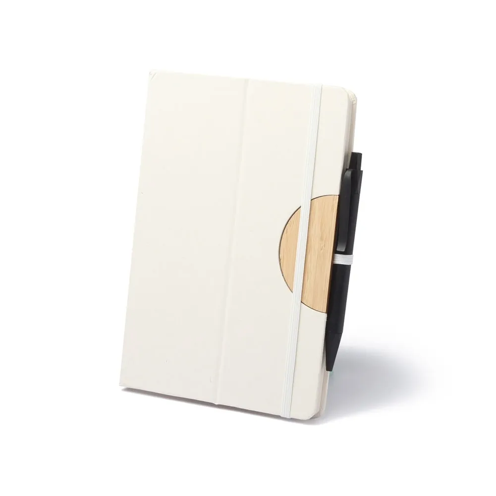 Caderno ecológico com suporte para caneta, capa com fragmento de bambu para utilização como suporte de celular. Capa dura feita com papel de caixa de leite, contém aproximadamente 80 folhas marfim com pauta pauta, marcador de página em cetim e elástico para lacre. OBS.: não acompanha caneta, foto ilustrativa.