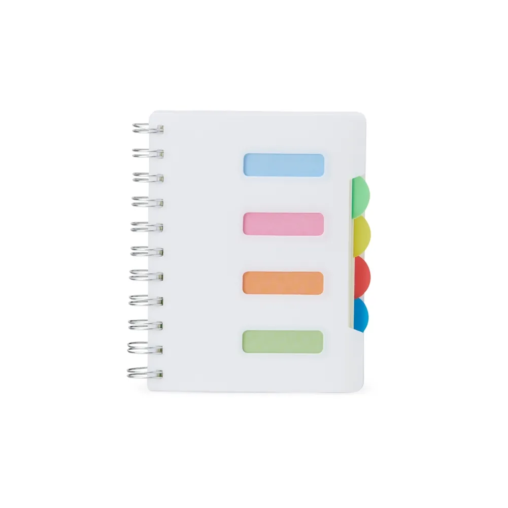 Caderno pequeno com 4 divisórias e abas para identificações, capa plástica com wire-o metálico. Contém aproximadamente 103 folhas marfins e folha inicial com tarjas para organizar e identificar as divisórias.