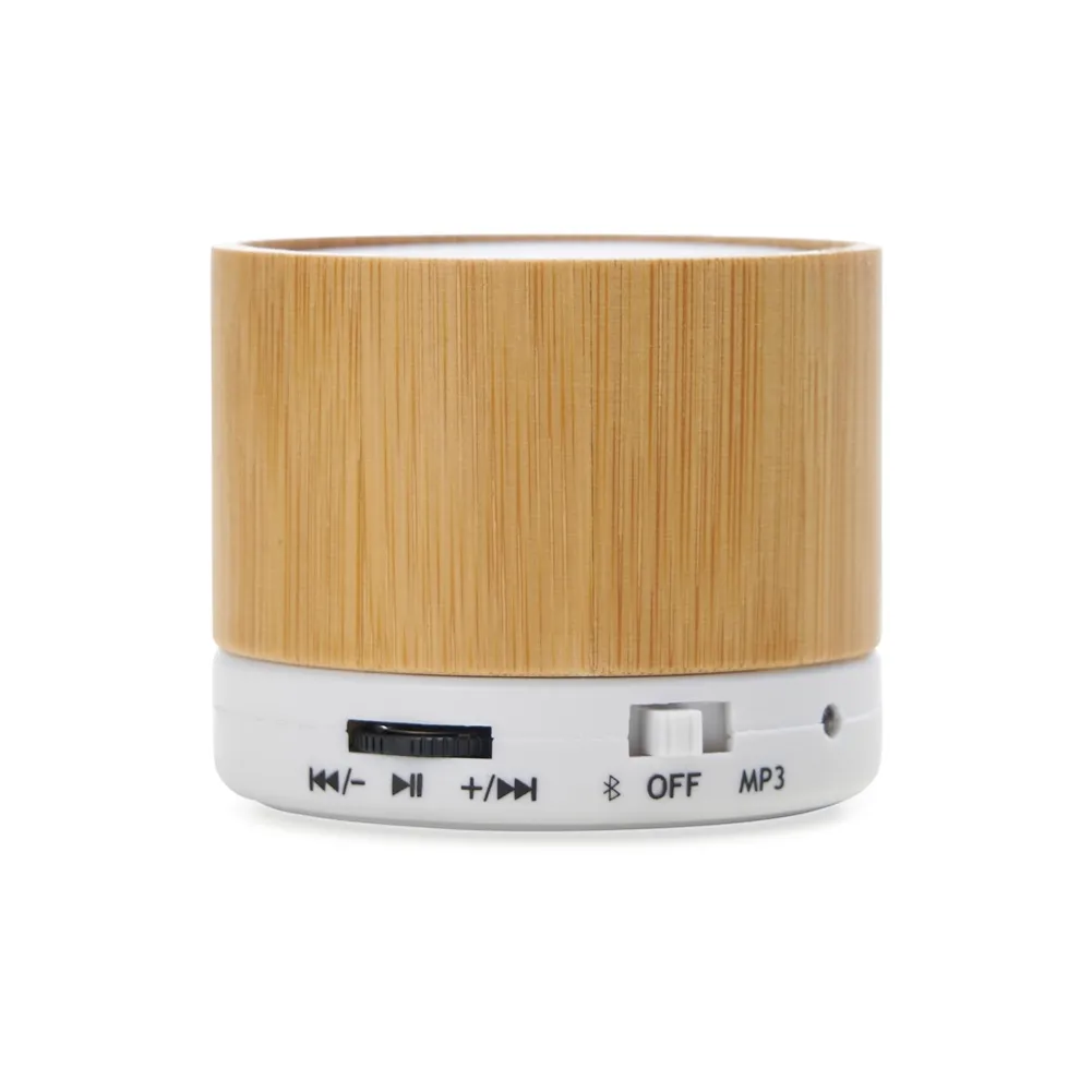 Caixa de som multimídia com Bluetooth e entrada para cartão TF. Material plástico com acabamento em bambu, possui a parte inferior com detalhes em relevo de algumas funções: botão Off/On; entrada para cartão MicroSD. Parte inferior com detalhe emborrachado anti-deslizante, acompanha cabo USB