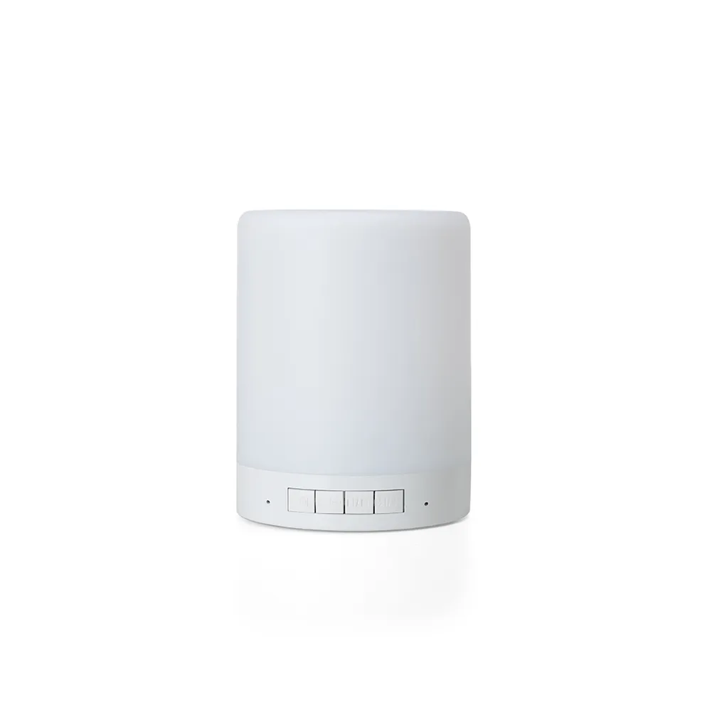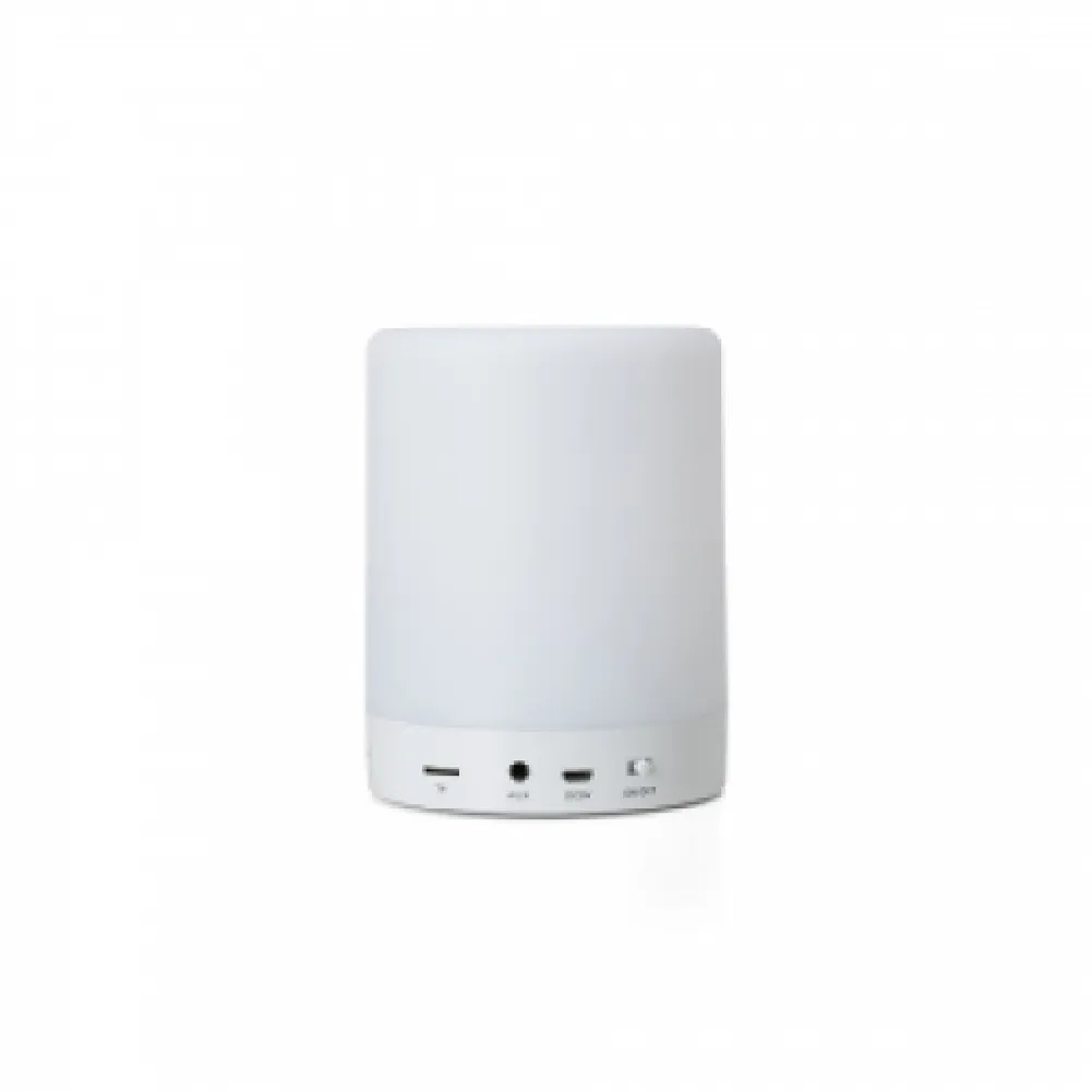 Caixa de som multimídia com luzes. Material plástico resistente na cor branca fosca, parte superior com falante e sensor touch para troca de luzes. Parte inferior branca leitosa, base com EVA antideslizante e alça de alumínio para transporte. A caixinha executa nos modos Bluetooth, rádio FM, auxiliar e cartão TF (MicroSD). Acompanha cabo USB e cabo Auxiliar (P2).