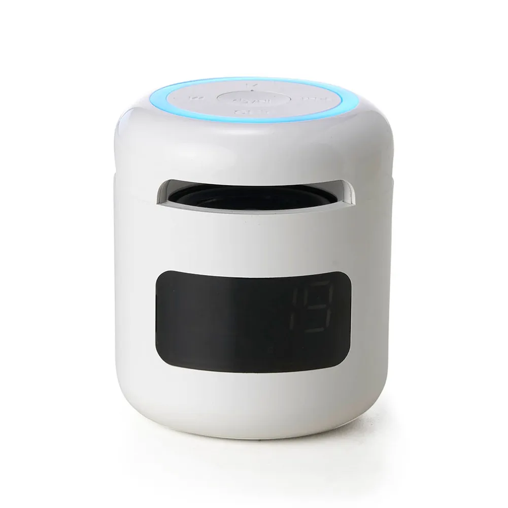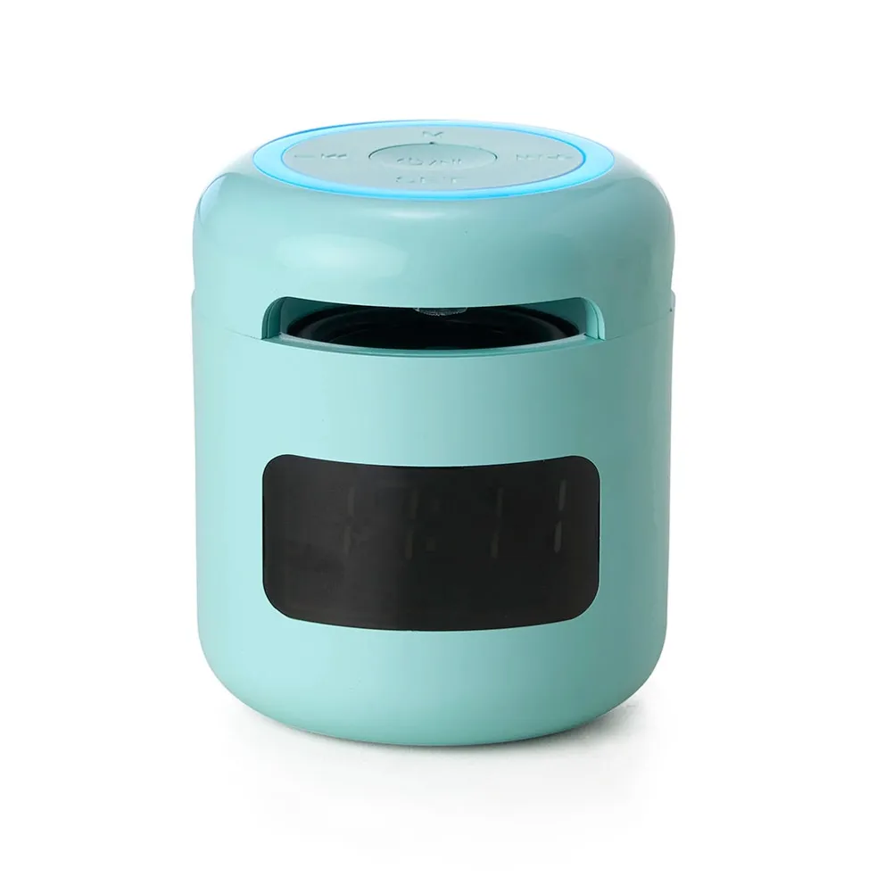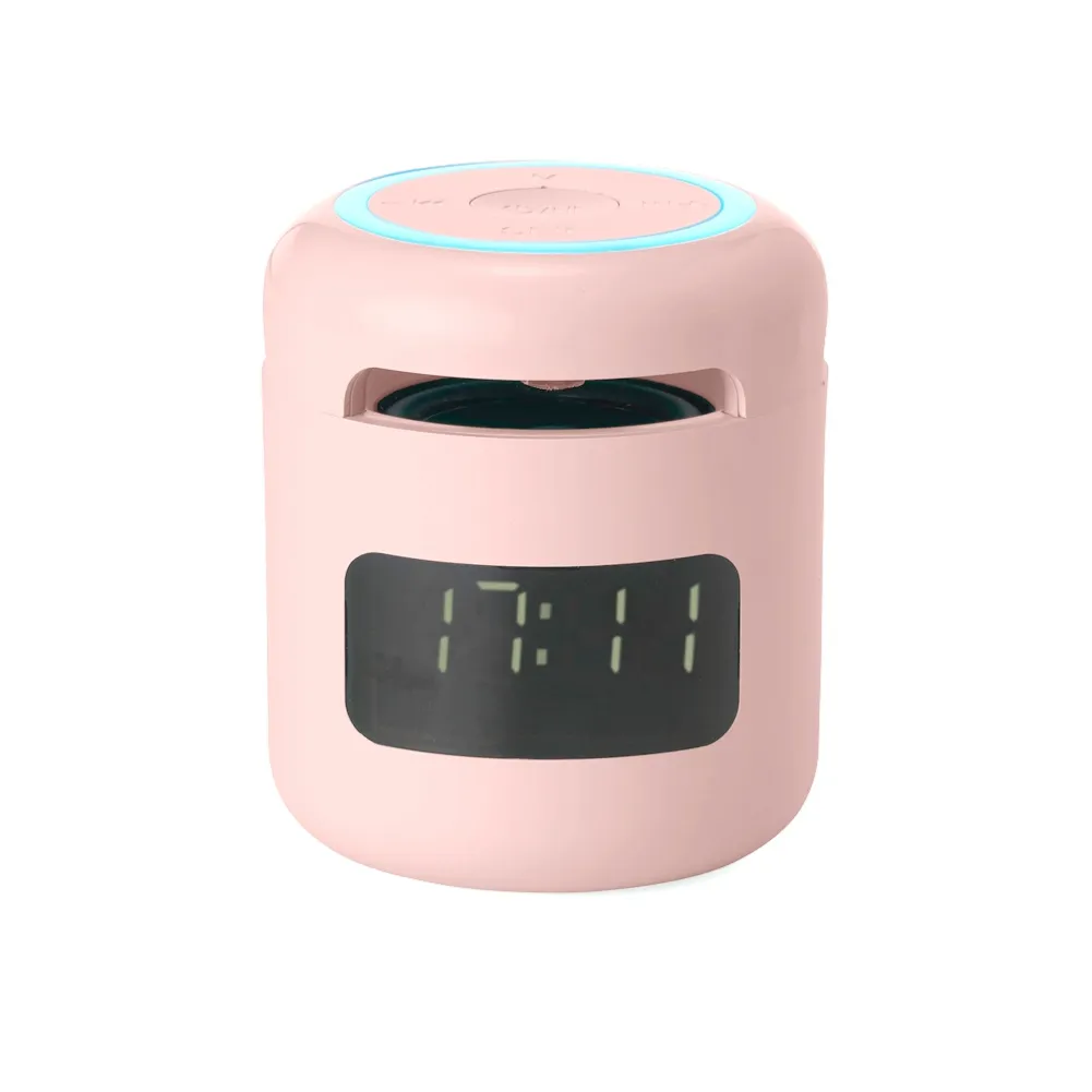 Caixa de som multimídia com relógio despertador. Produzida em plástico e com borrachas antiderrapantes na área inferior, a caixa de som tem bateria de longa duração, display de LED na área frontal, e anel de led brilhante na parte superior. A caixa de som executa nos modos bluetooth, rádio FM, cartão TF-microSD e entrada auxiliar P2. Acompanha cabo USB e manual em inglês e chinês.