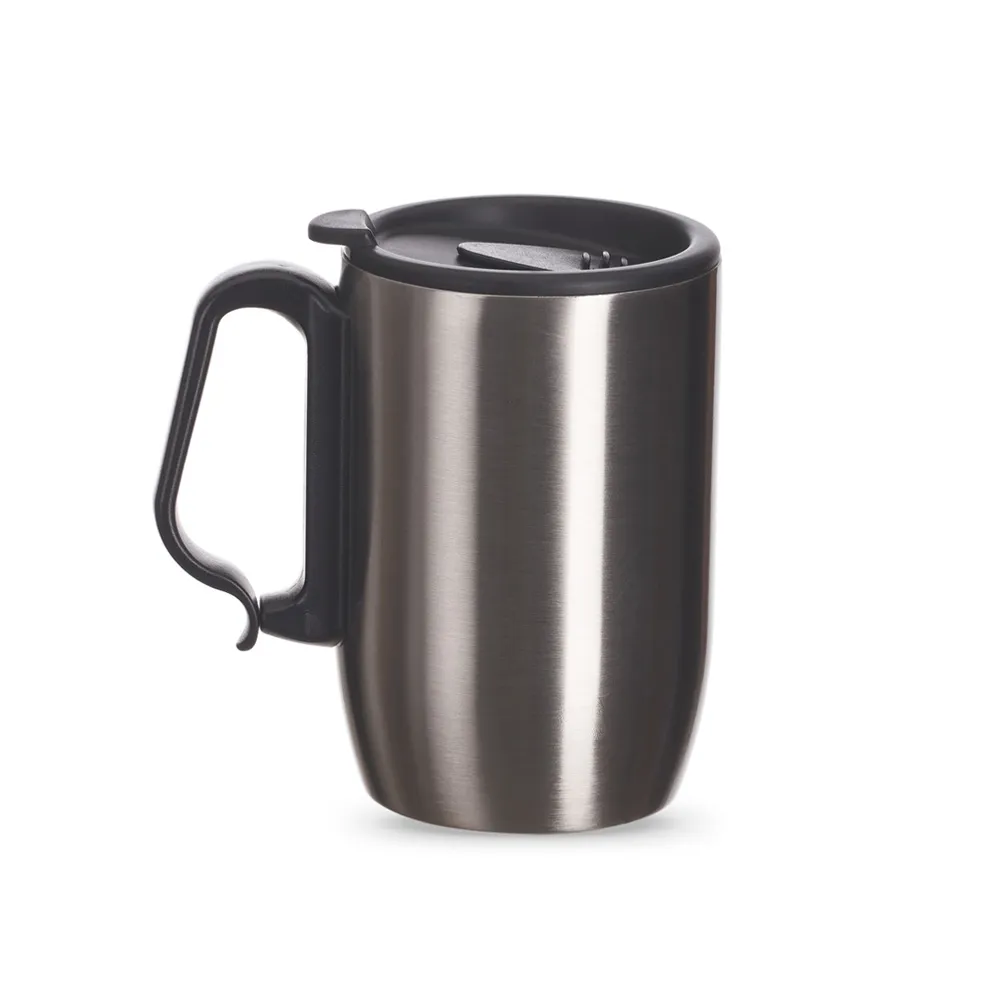 Caneca inox 350ml com parede dupla. Possui tampa plástica com trava para abertura do bocal, alça plástica estilo mosquetão e base com apoio EVA. Obs.: Conserva temperatura.