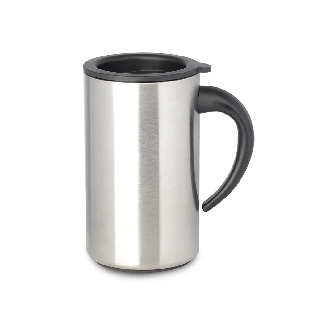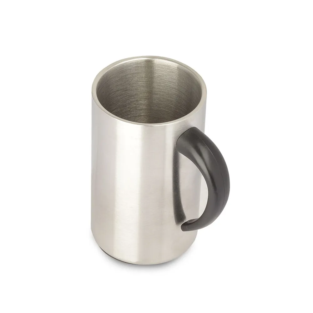 Caneca térmica em aço inox com parede dupla e alça de plástico. Com capacidade de até 300 ml.
