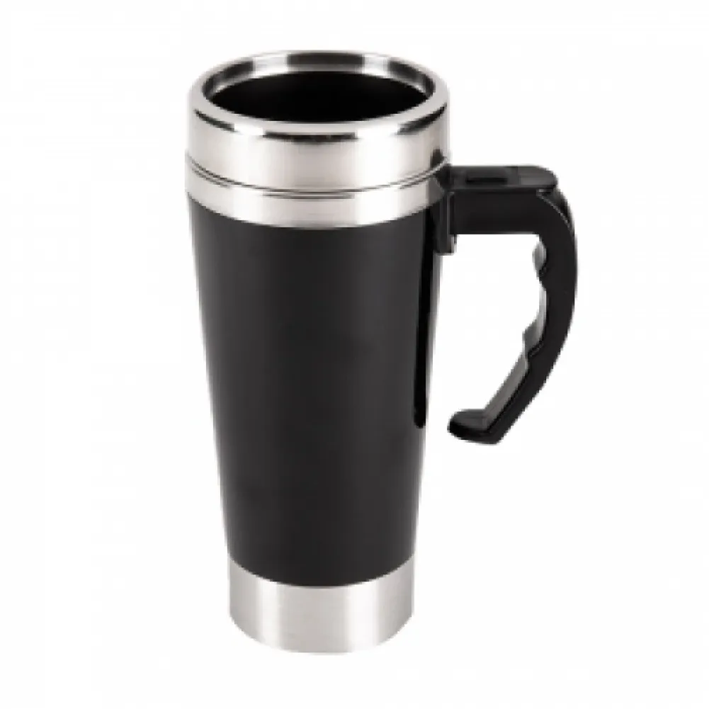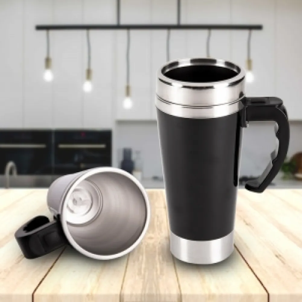 Caneca de inox com capacidade de 400ml . Vem acoplado em seu interior uma hélice de silicone para misturar. O produto utiliza duas pilhas AA que não este incluso. Acompanha uma tampa de plástico e inox. O botão para a ativação da função mixer fica em cima da alça.