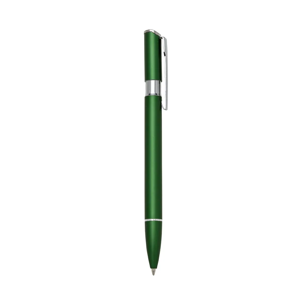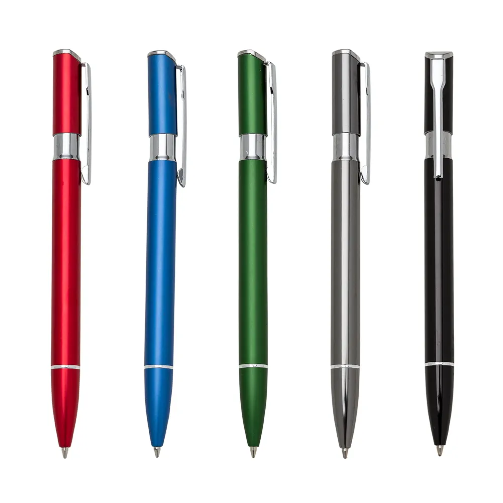 Caneta alumínio, carga esferográfica azul e acionamento por clique.