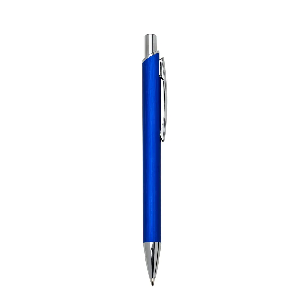 Caneta alumínio, carga esferográfica azul e acionamento por clique.