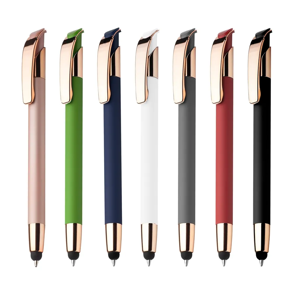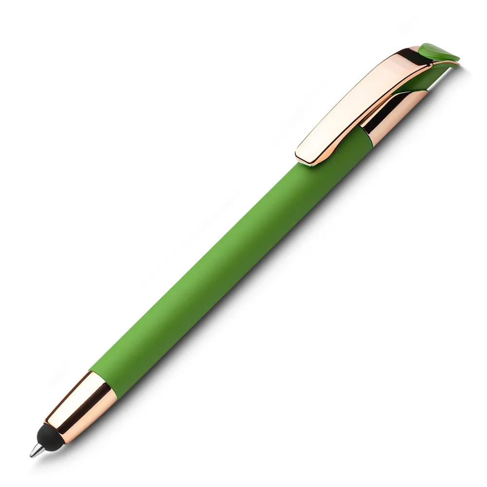 Caneta touch screen em alumínio reciclado com acabamento similar à borracha. Acionamento por clique e carga esferográfica azul 1.0mm.