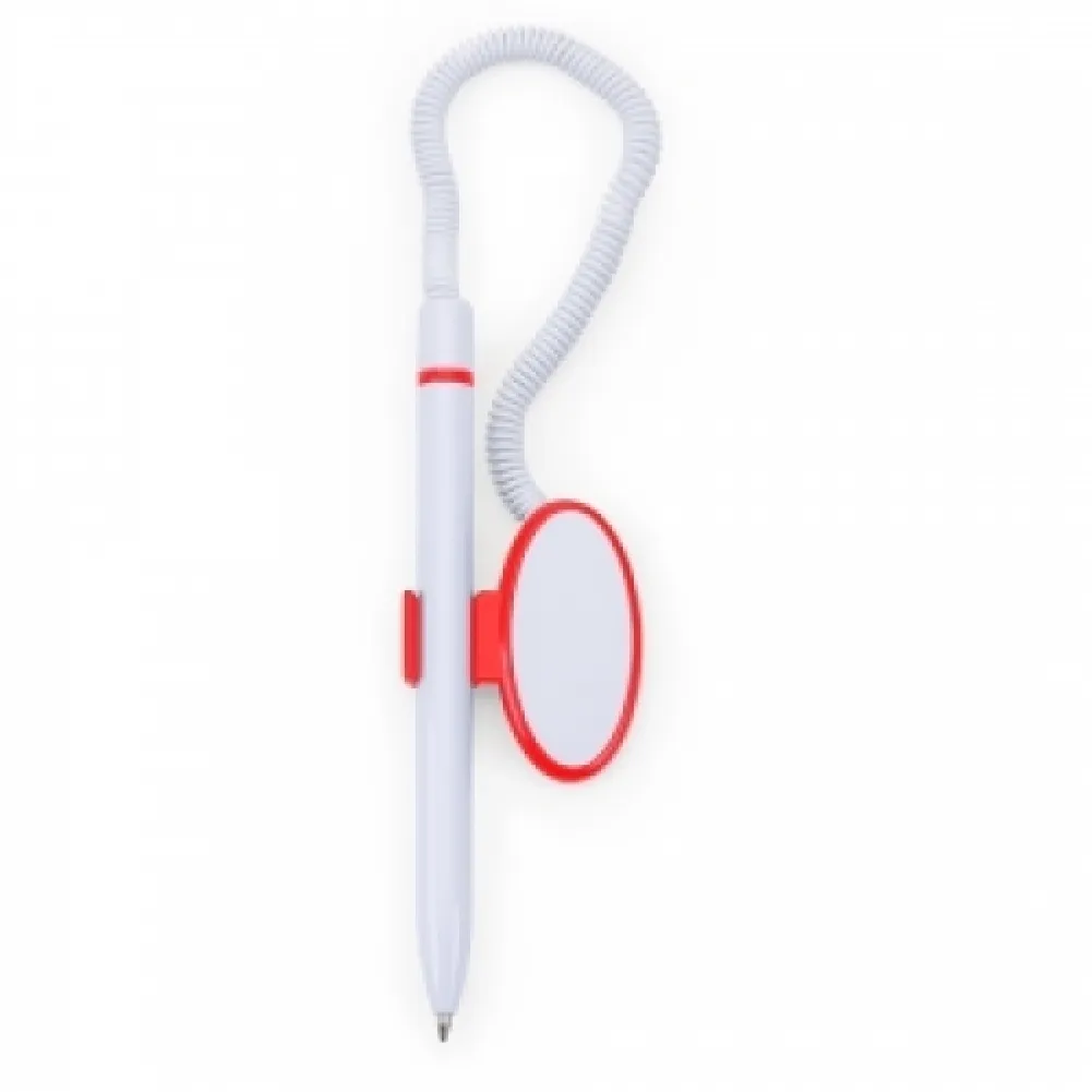 Caneta balcão plástica com suporte e adesivo auto colante. Carga esferográfica azul.