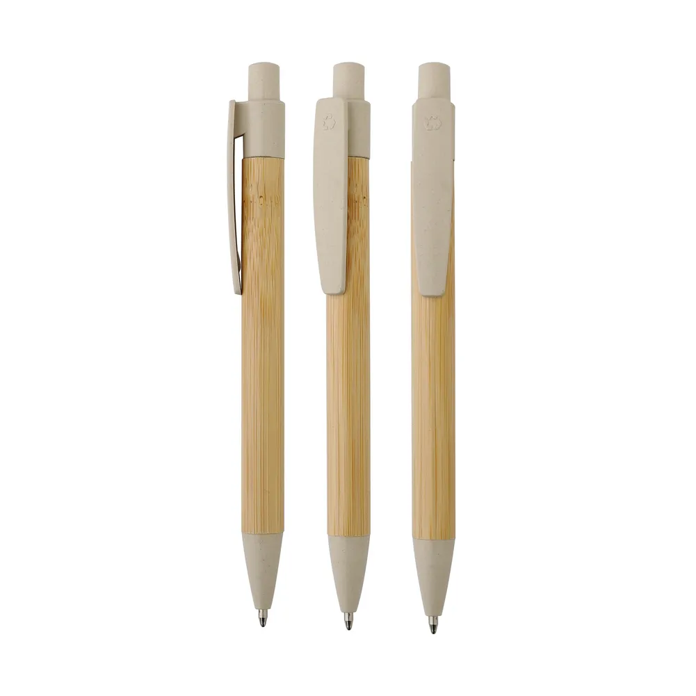 Caneta corpo de bambu com detalhes em plástico. Acompanha estojo de papel bambu print.