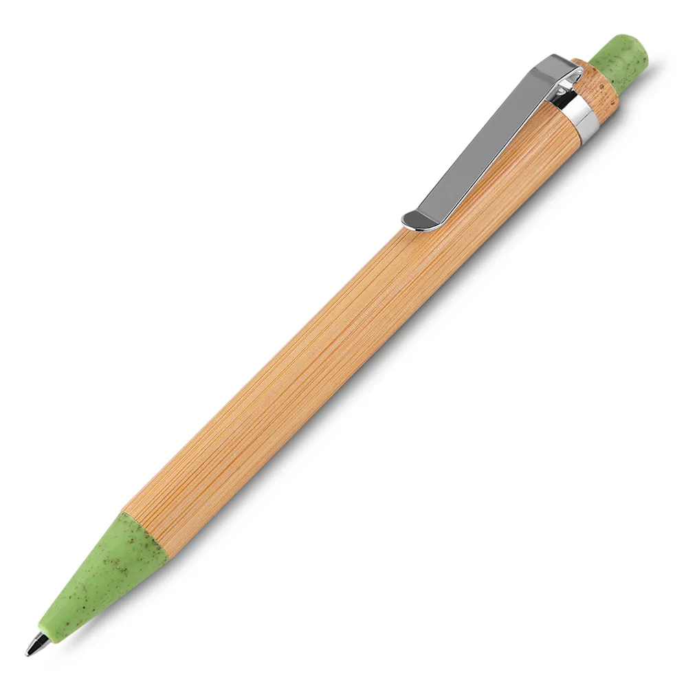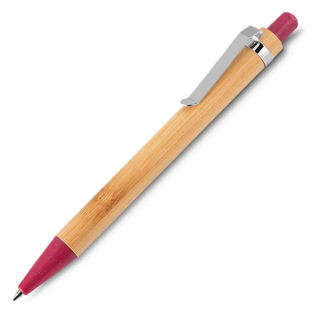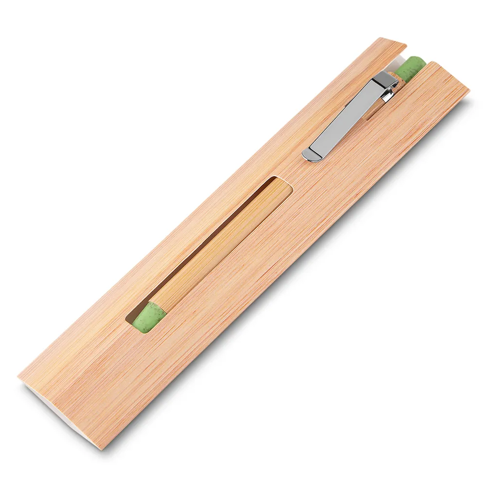 Caneta corpo de bambu com detalhes em plástico e metal. Acompanha estojo de papel bambu print.