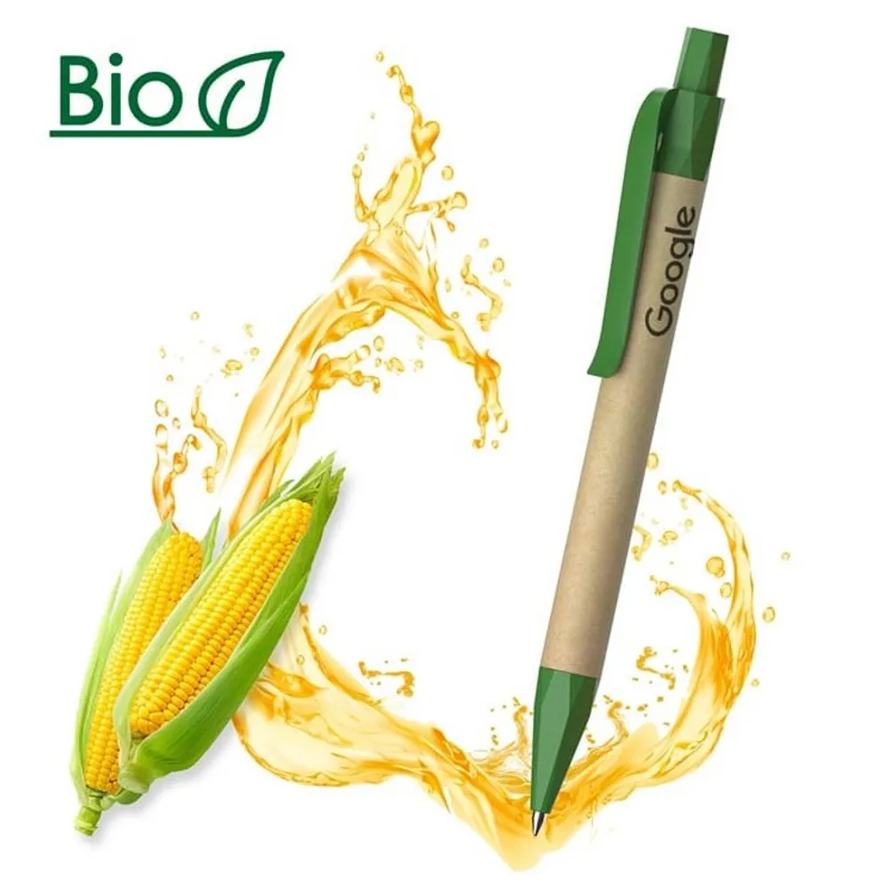 Caneta corpo em papel reciclado com detalhes em plástico PLA biodegradável.