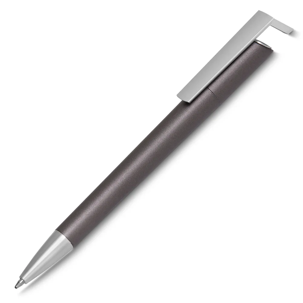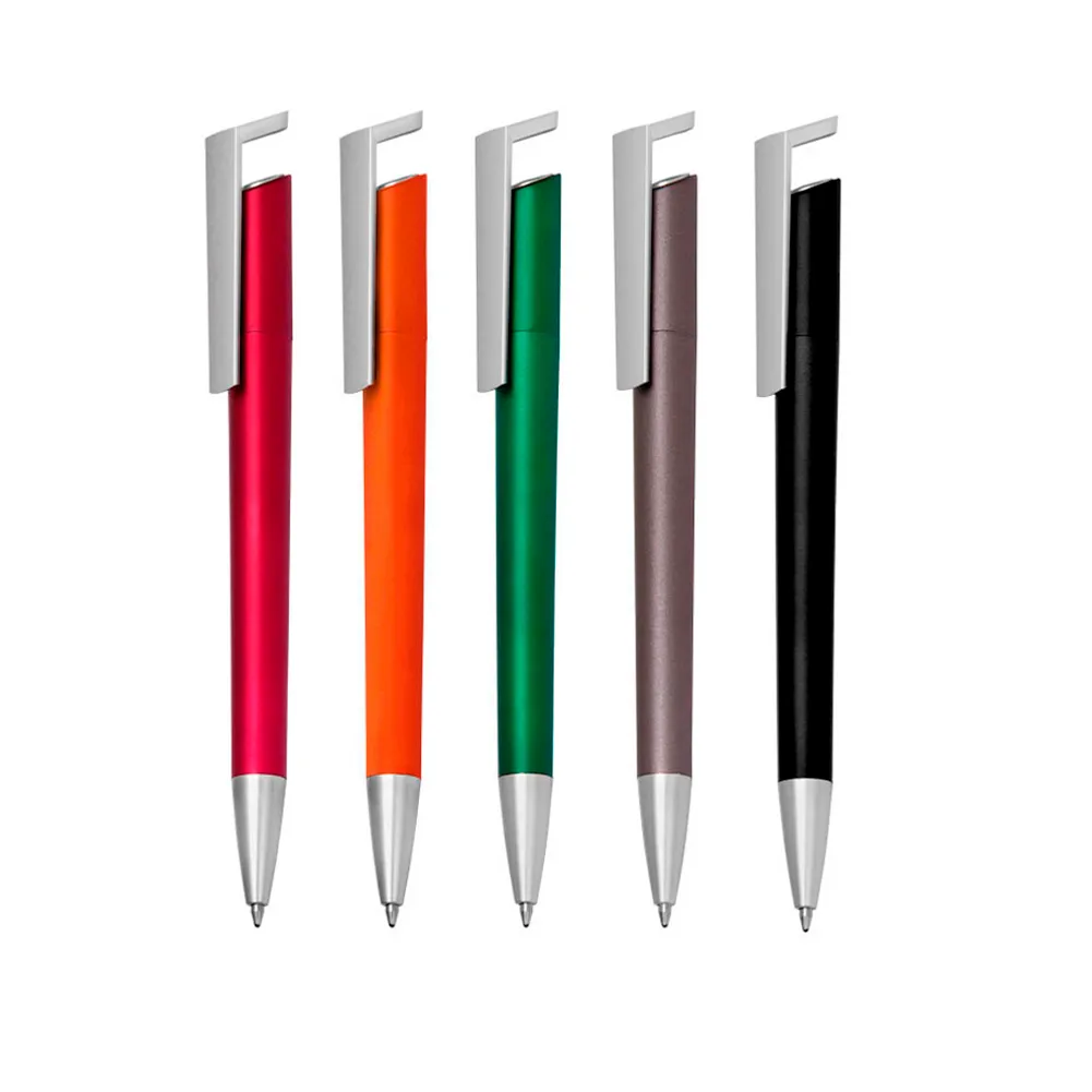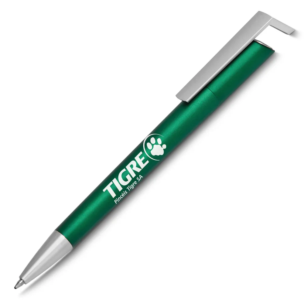 Caneta esferográfica retrátil escrita em azul. NÃO TEM SUPORTE PARA CELULAR.