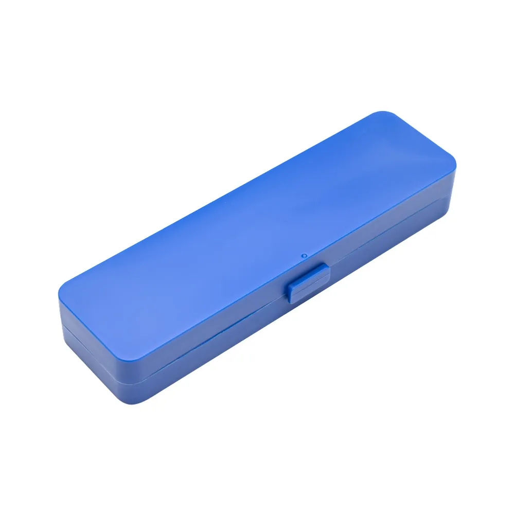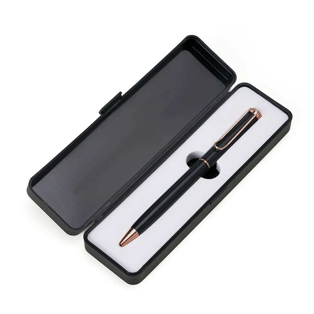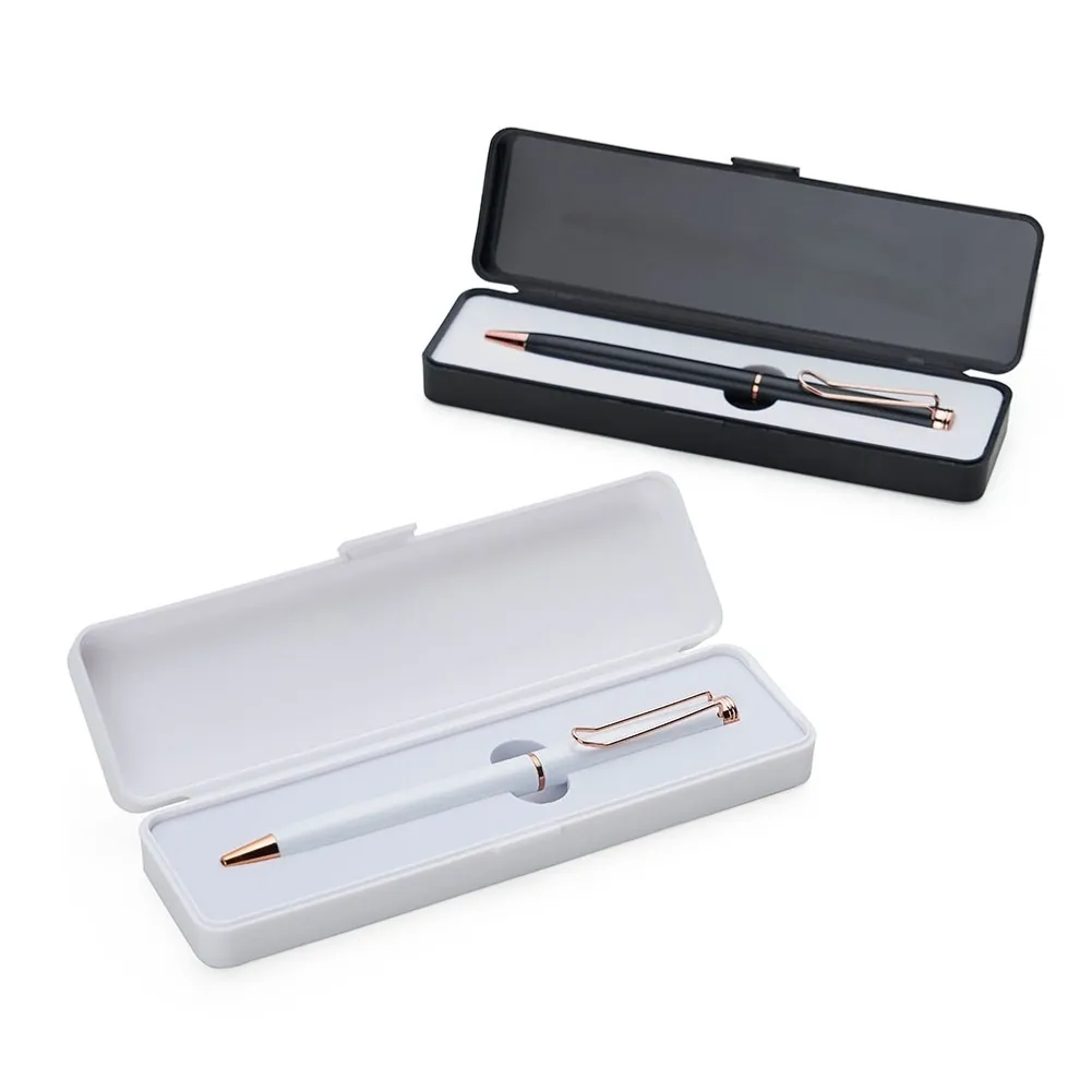 Conjunto caneta metálica com estojo de plástico e berço espumado. Carga esferográfica azul e acionamento por rotação.