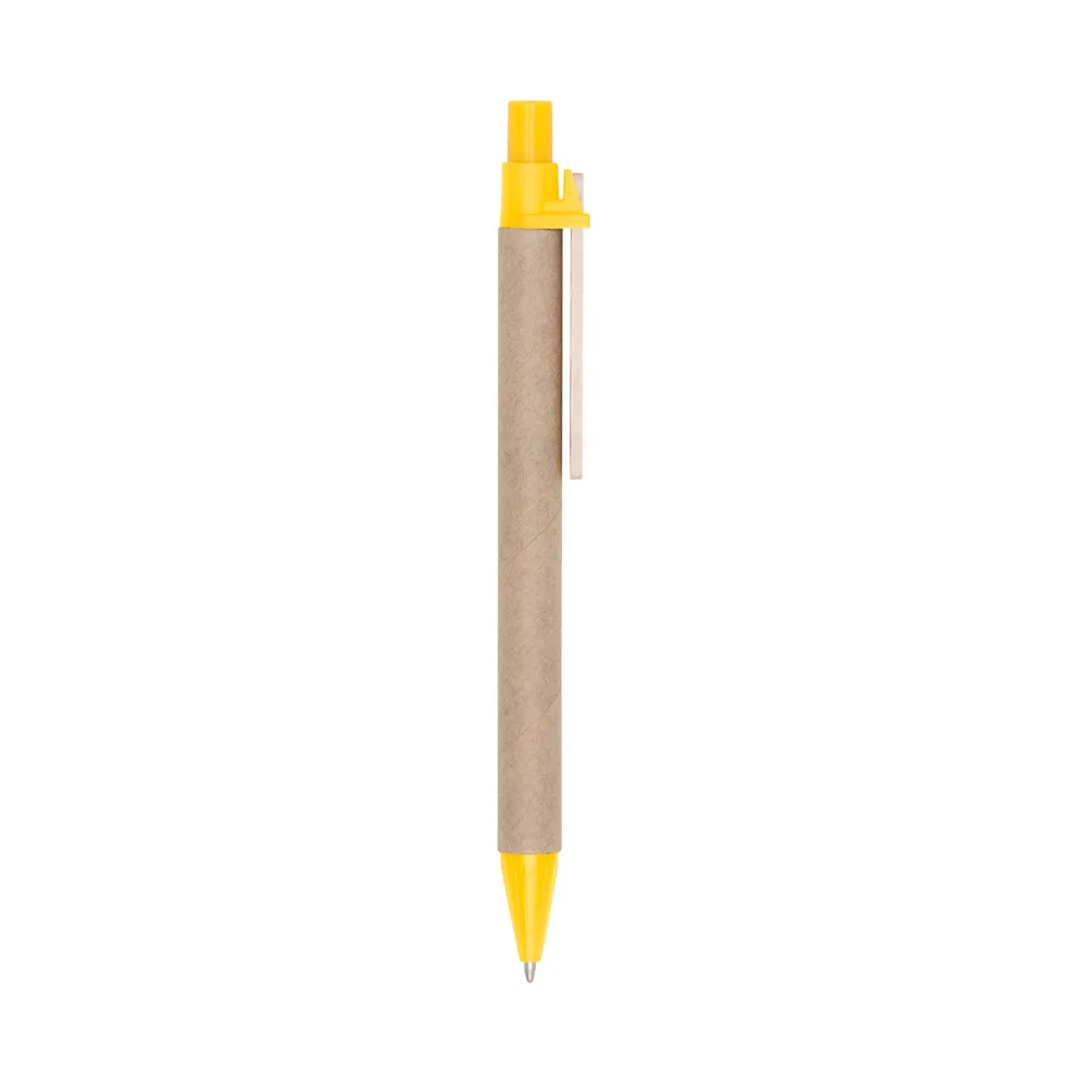 Caneta ecológica de papelão com detalhes coloridos. Clip de madeira e ponteira plástica, possui relevo na ponteira. Aciona por clique.