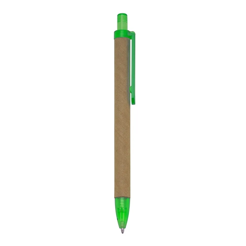 Caneta de papelão com detalhes plásticos translúcidos, carga esferográfica azul e acionamento por clique.