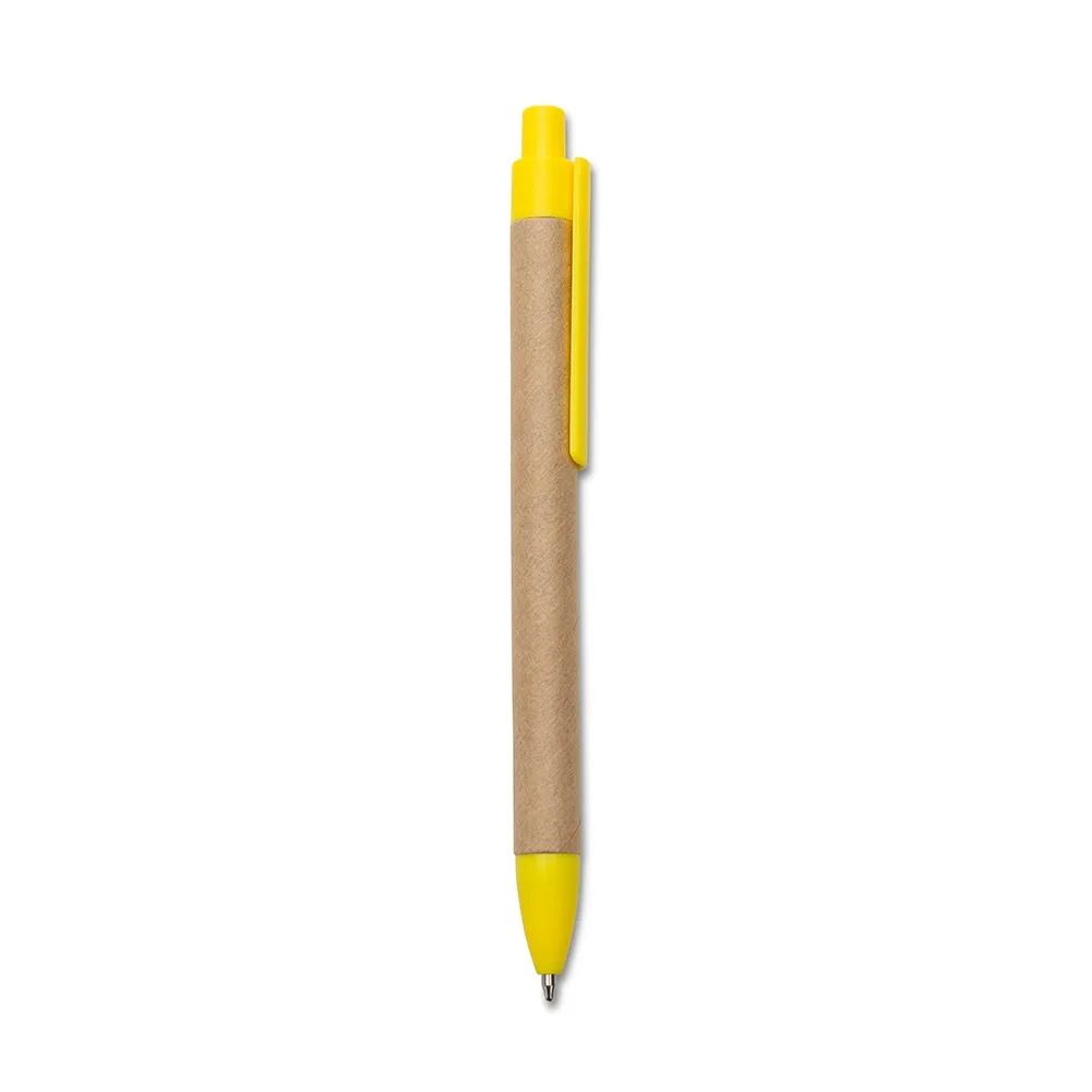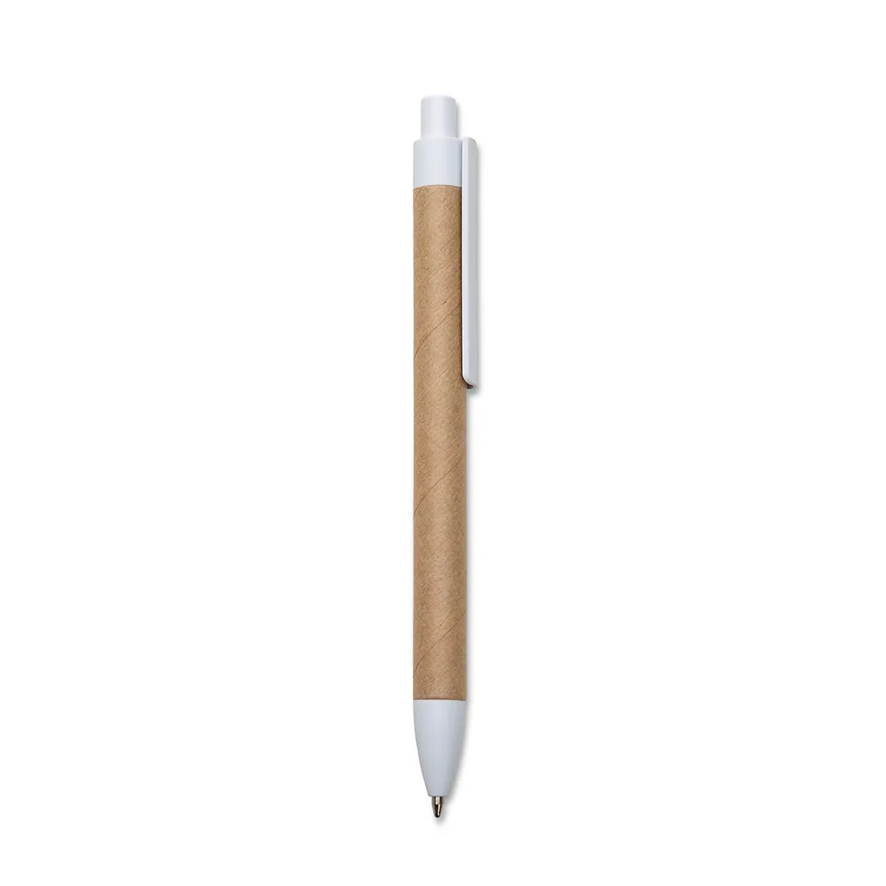 Caneta de papelão com detalhes plásticos, carga esferográfica azul e acionamento por clique.