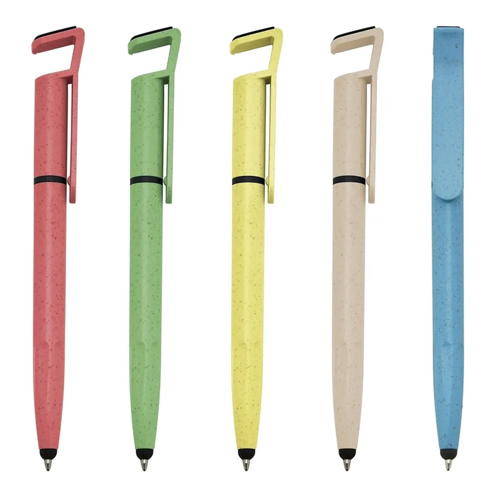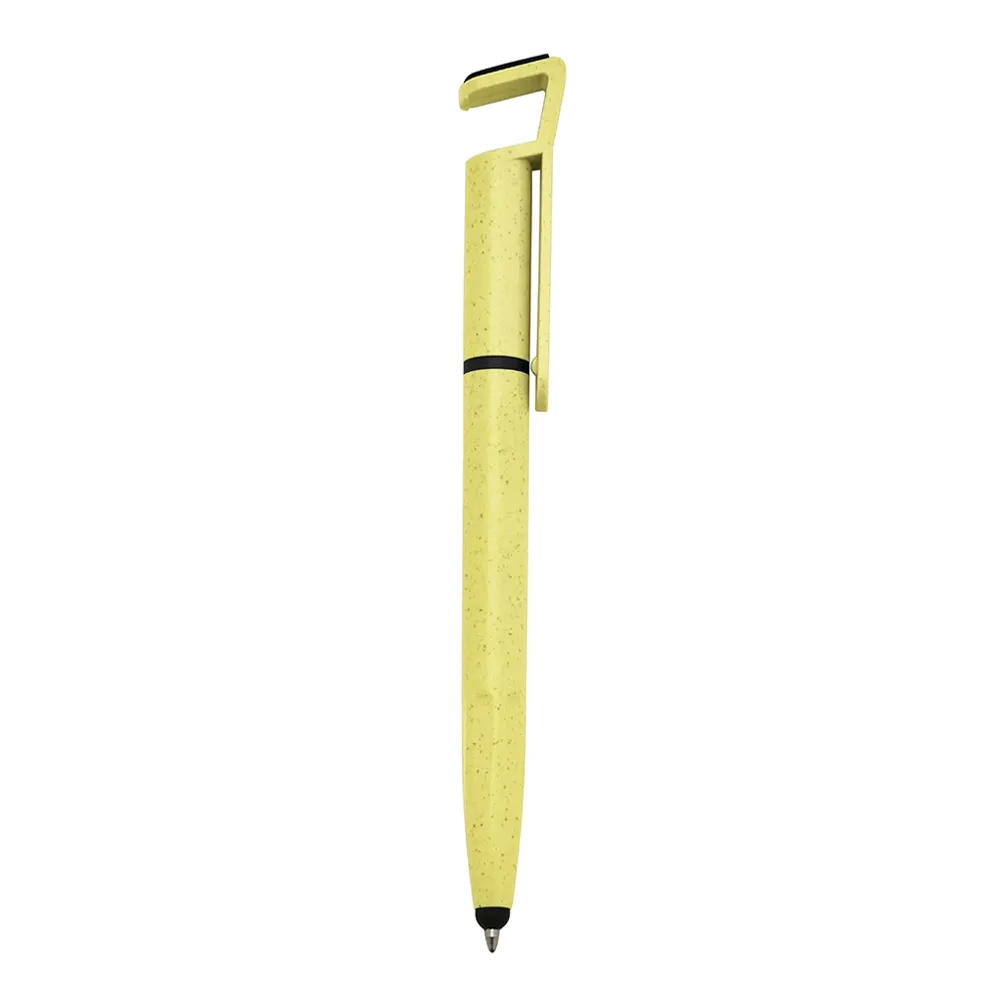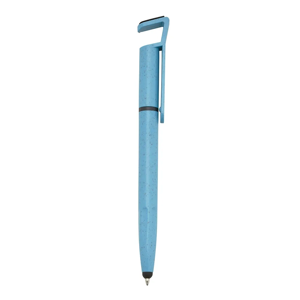 Caneta fibra de bambu com suporte para celular, ponteira touch screen e limpador de tela. Carga esferográfica azul e acionamento por rotação.