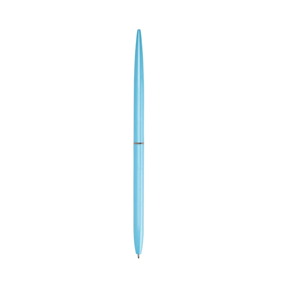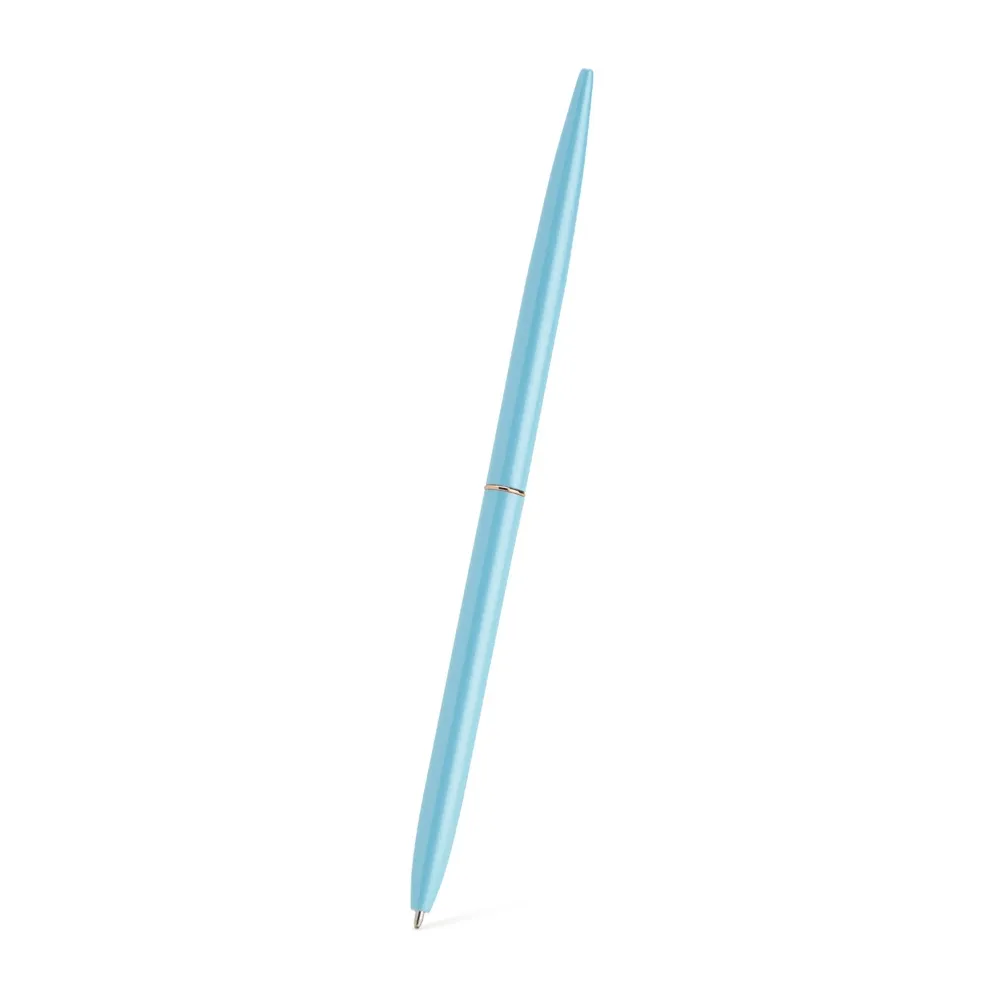 Caneta metálica com acionamento por rotação e carga esferográfica azul 1mm.