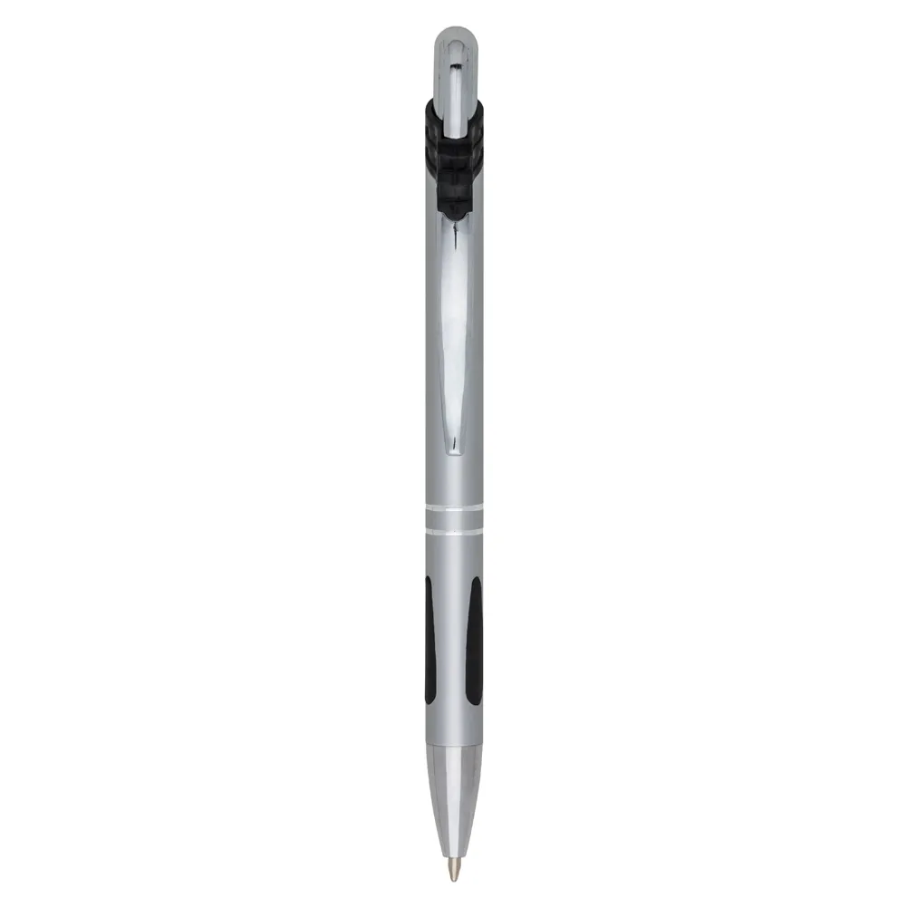 Caneta metálica com detalhe emborrachado, carga esferográfica azul e acionamento por clique.