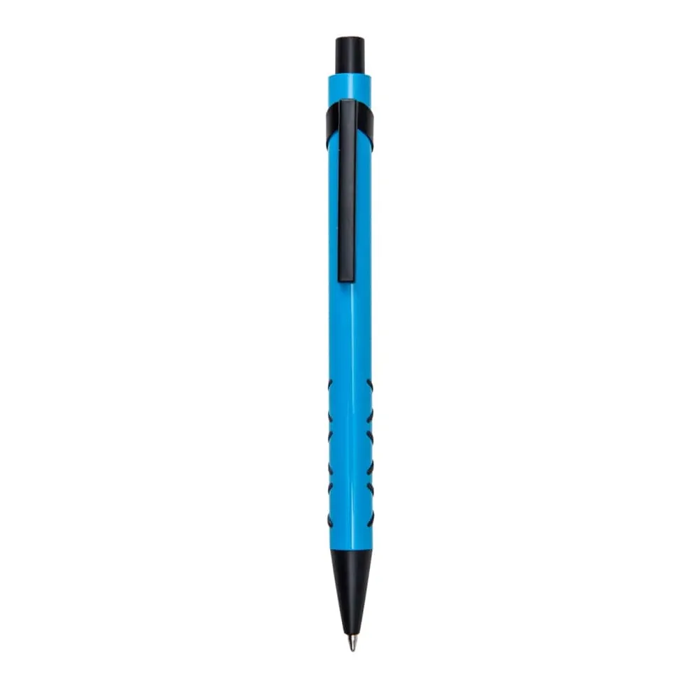 Caneta metálica com detalhe emborrachado, carga esferográfica azul e acionamento por clique. OBS.: PEDIDO APENAS MÚLTIPLO DE 50 PEÇAS!