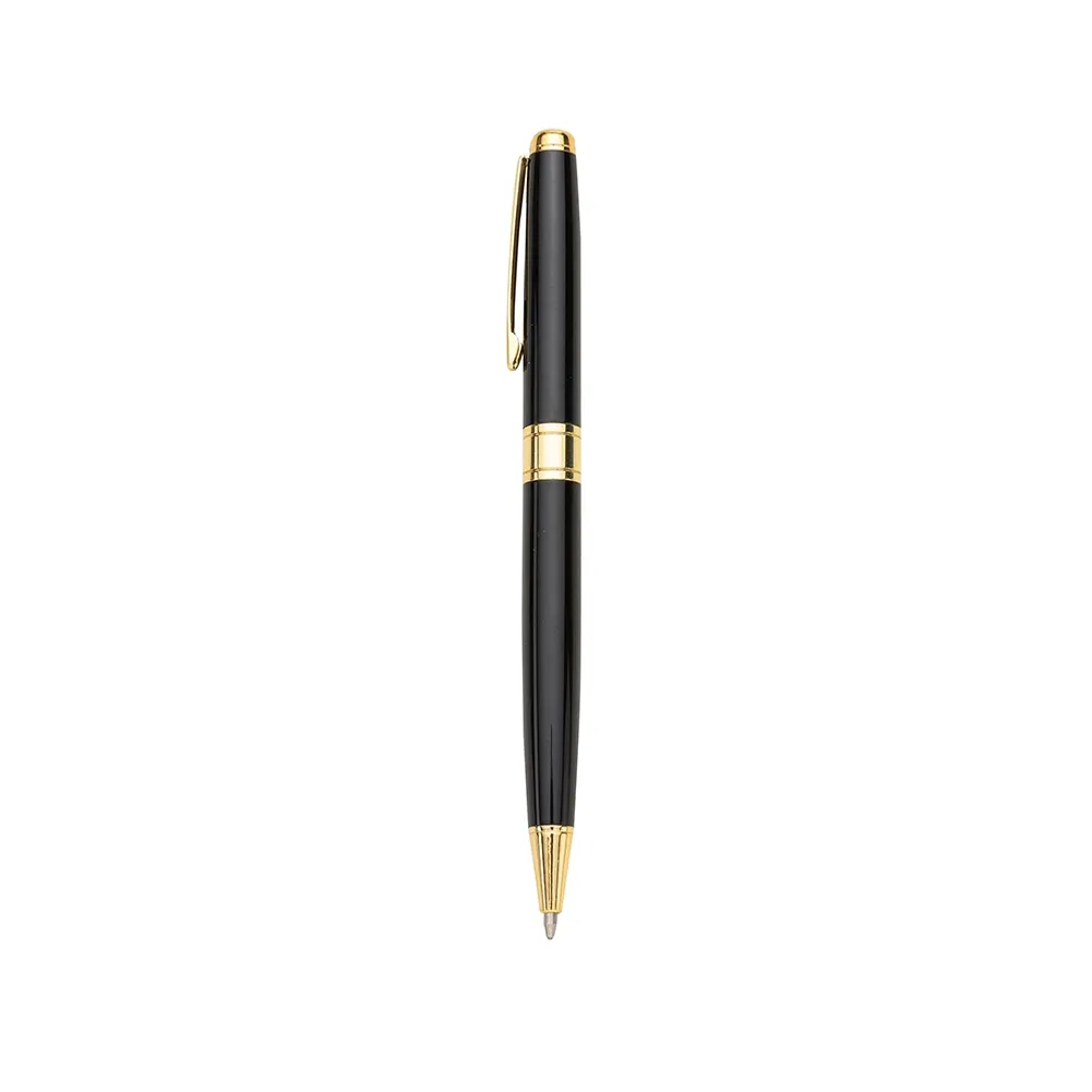Caneta metálica com carga esferográfica azul e acionamento por rotação.