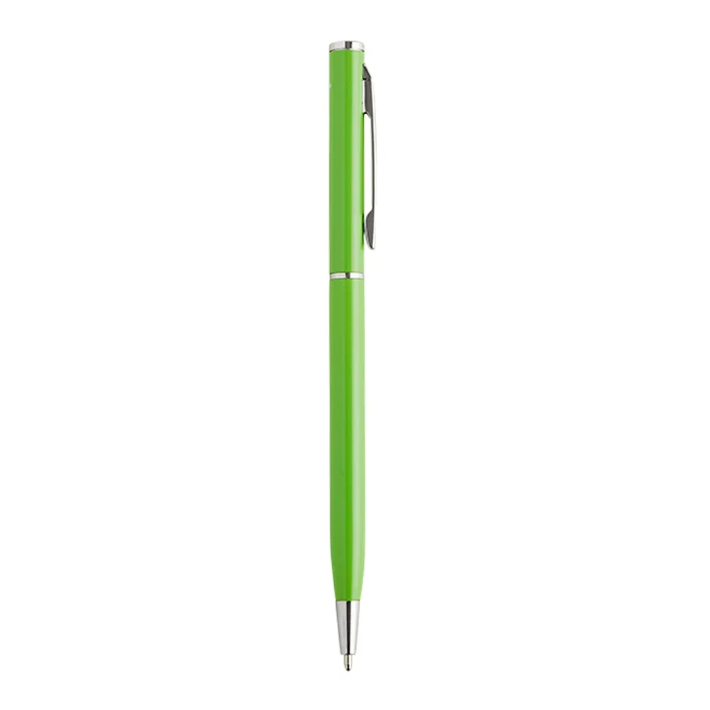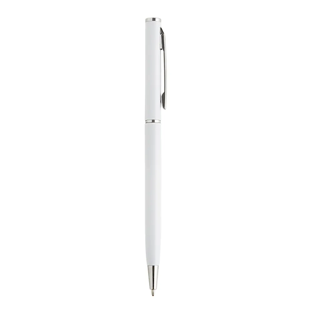 Caneta metálica com carga esferográfica azul 1.0mm e acionamento por rotação.