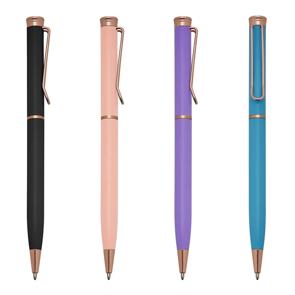 Caneta metálica com carga esferográfica azul e acionamento por rotação.