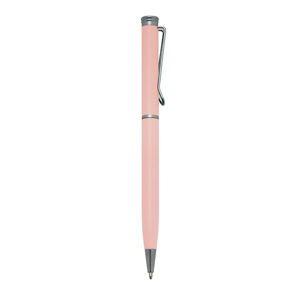 Caneta metálica com carga esferográfica azul e acionamento por rotação.