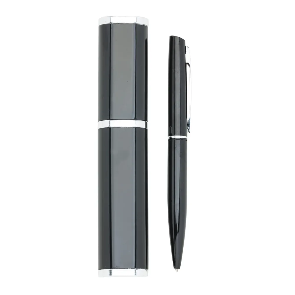 Caneta metálica em estojo tubo plástico. Caneta metal prata fosca com clip e anel central prata brilhante, aciona por giro. Estojo tubo prata com detalhes cromado, possui formato oval e material de plástico resistente. OBS.: PEDIDO APENAS MÚLTIPLO DE 50 PEÇAS!