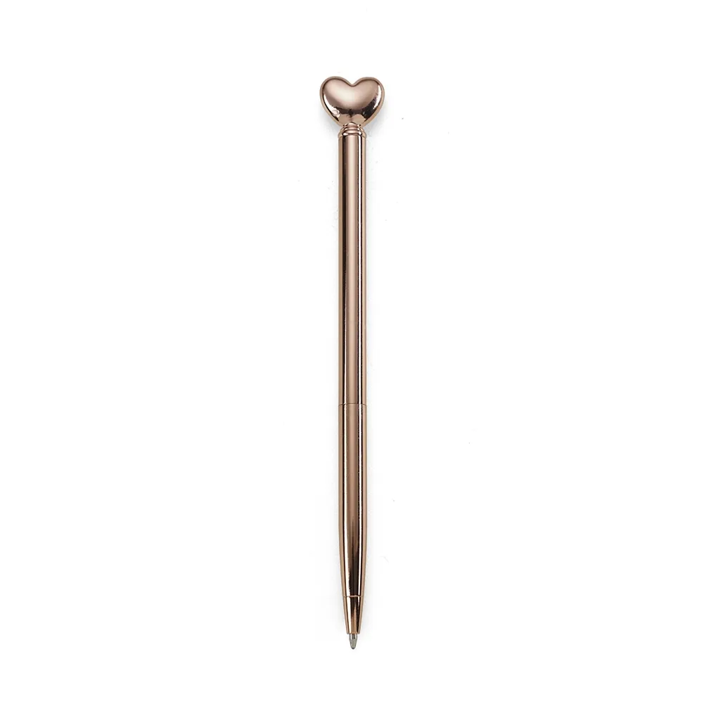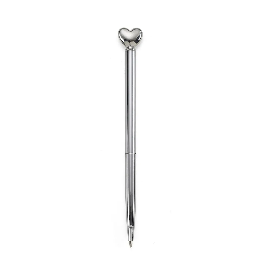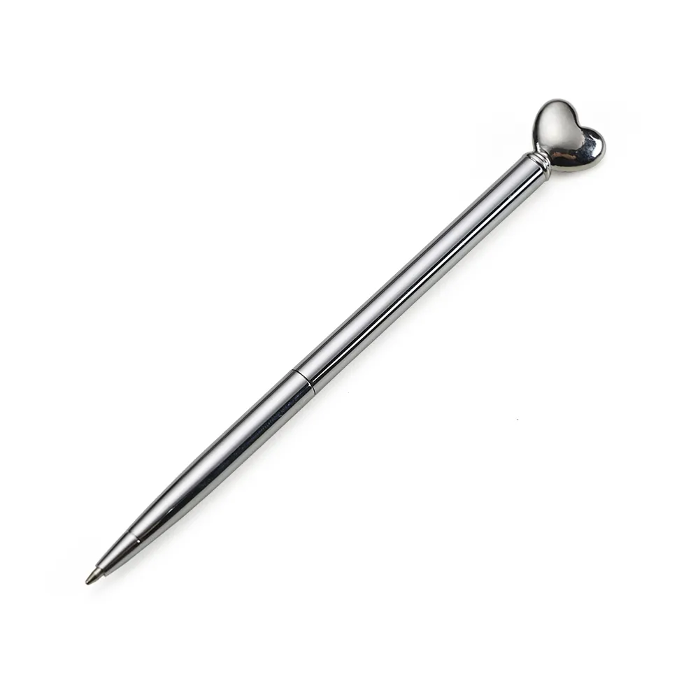 Caneta metálica com carga esferográfica azul e acionamento por rotação.