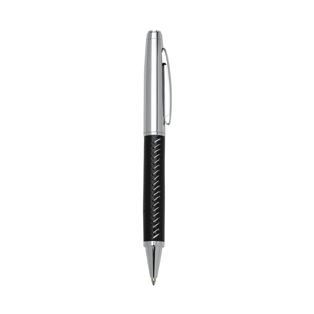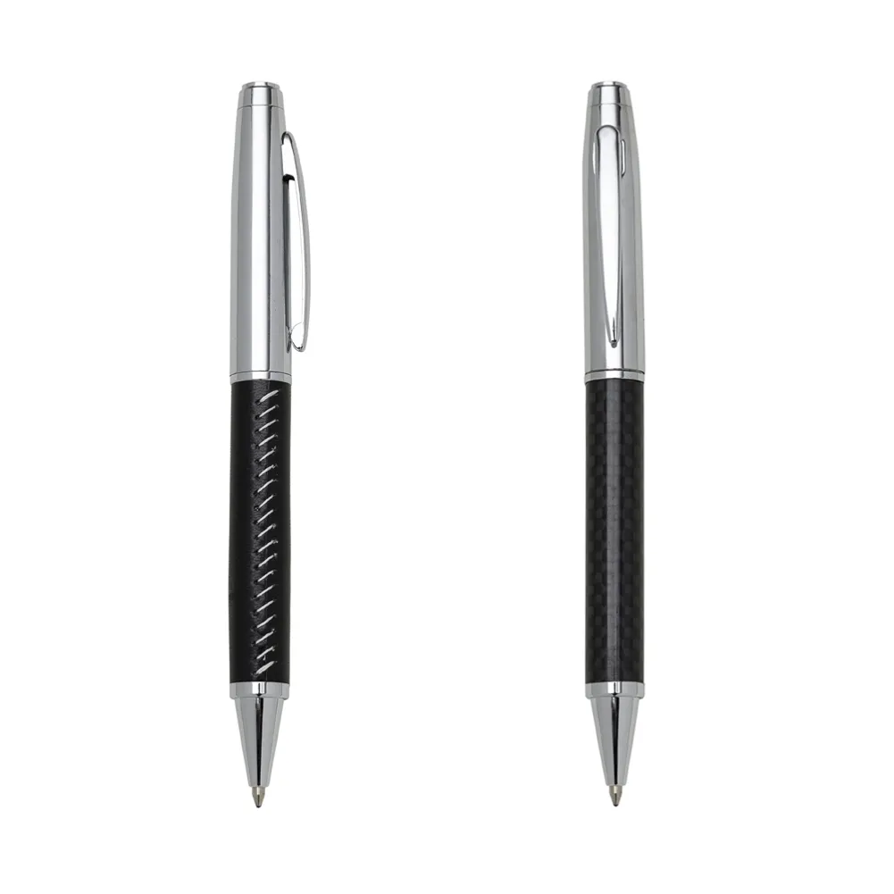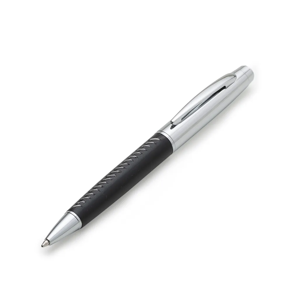 Caneta metálica com acabamento brilhante, versões em couro sintético e fibra preta. Carga esferográfica azul e acionamento por rotação.