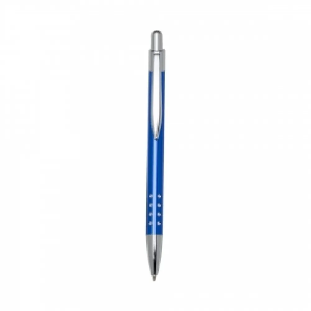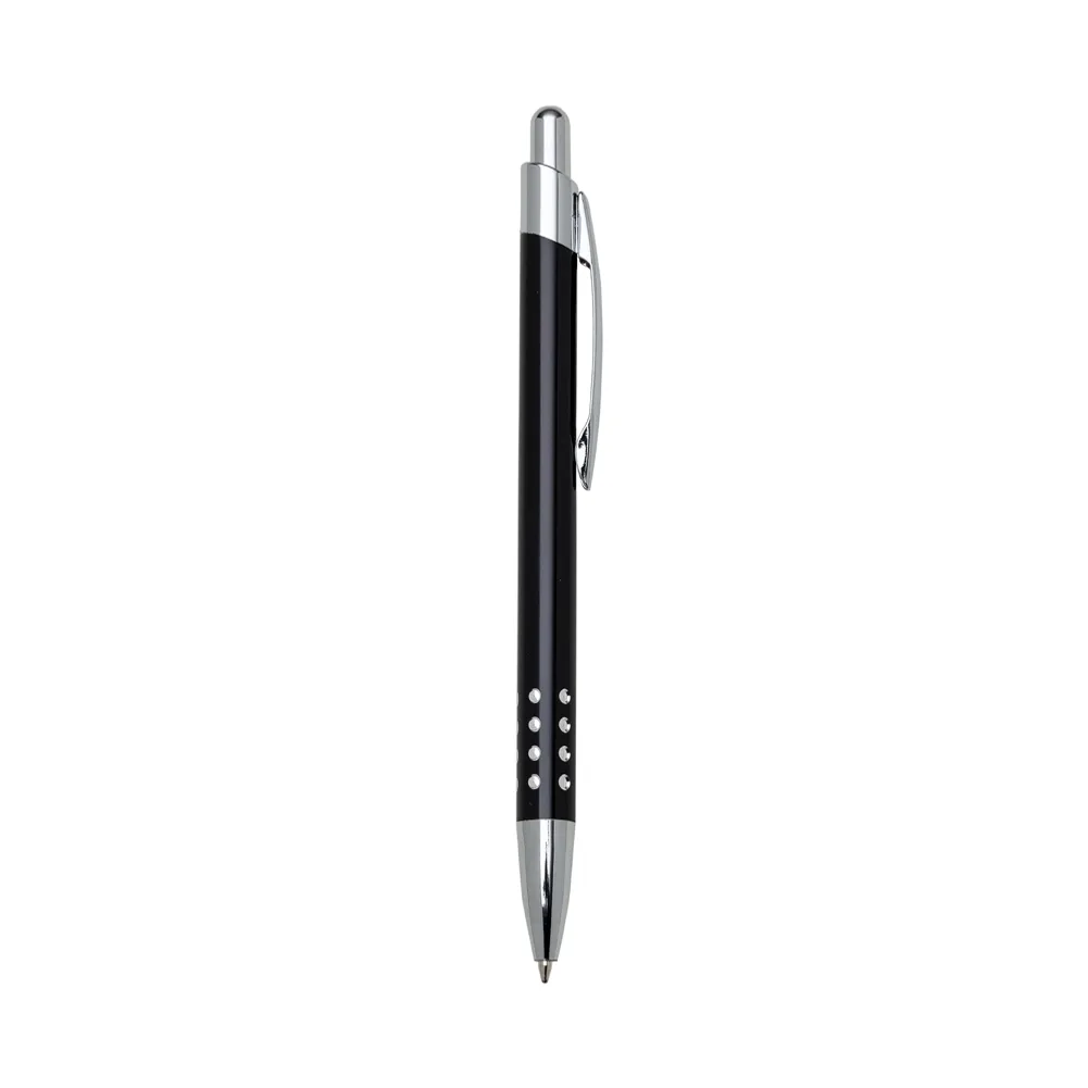 Caneta metálica com detalhes em cristal, carga esferográfica azul e acionamento por clique.