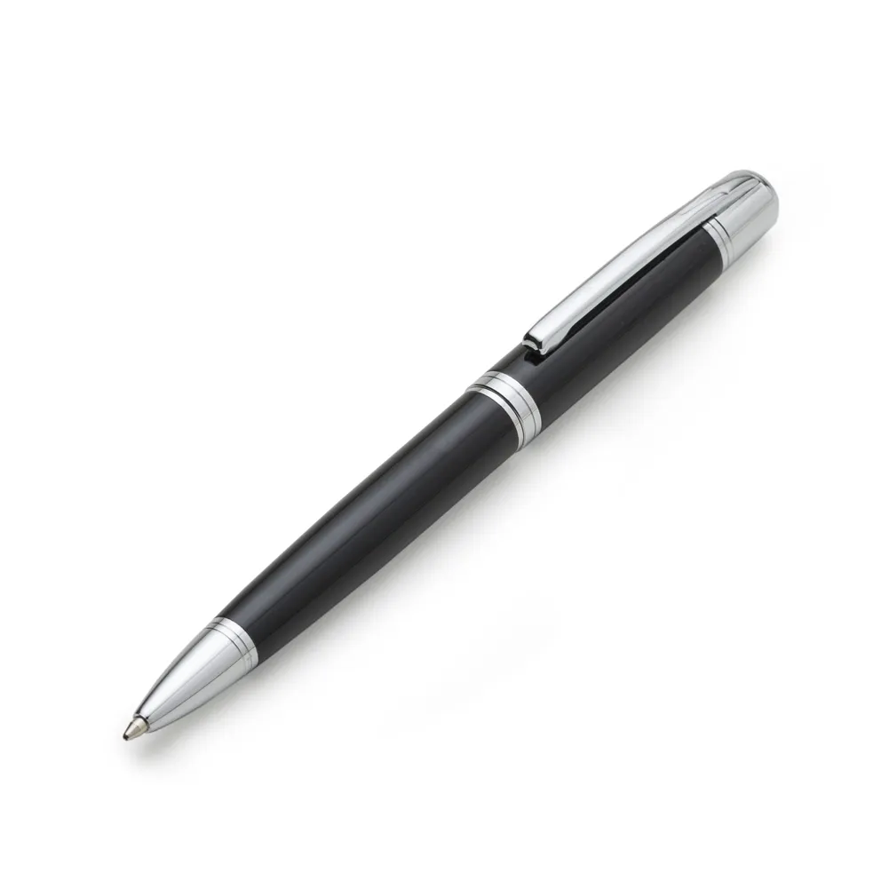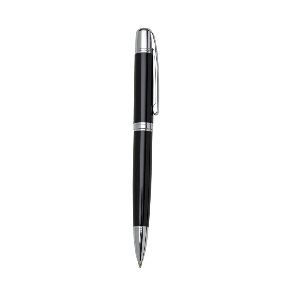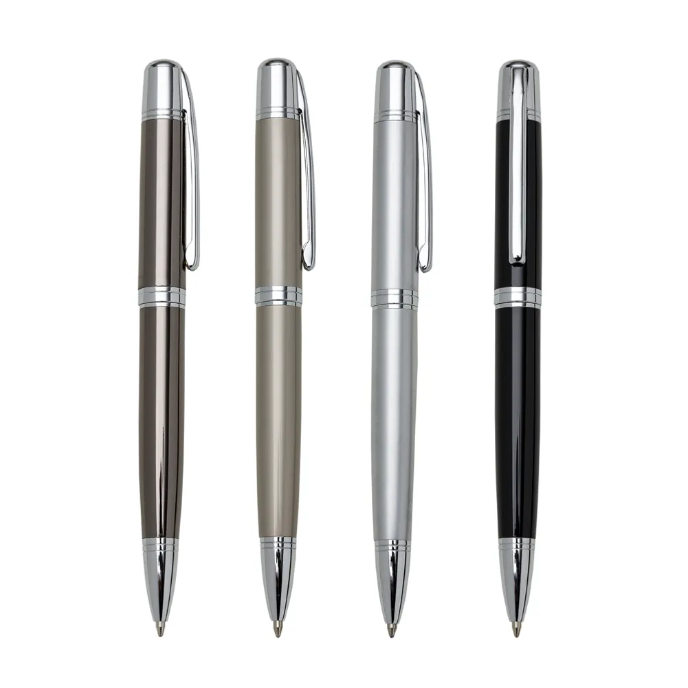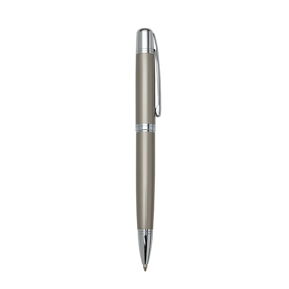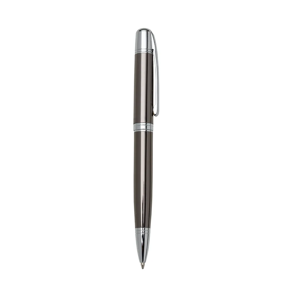 Caneta metálica com carga esferográfica azul e acionamento por rotação.