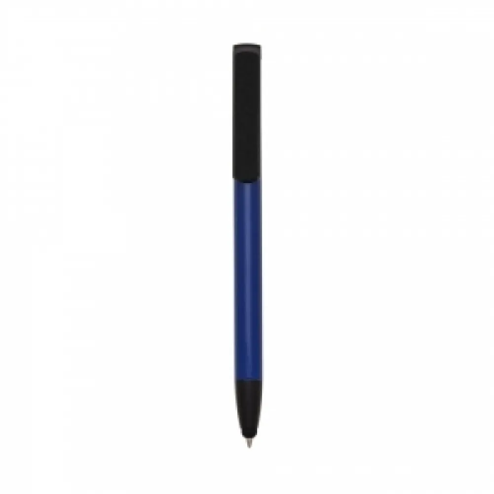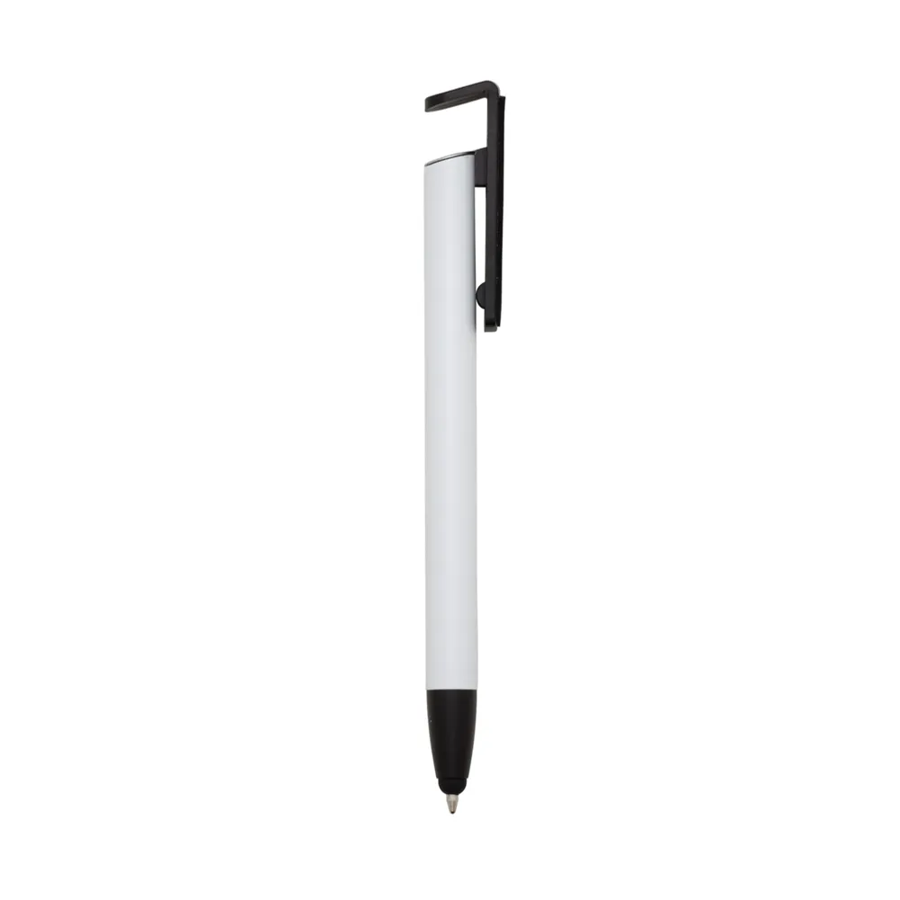 Caneta metálica com suporte para celular, ponteira touch screen e limpador de tela. Carga esferográfica azul e acionamento por clique.